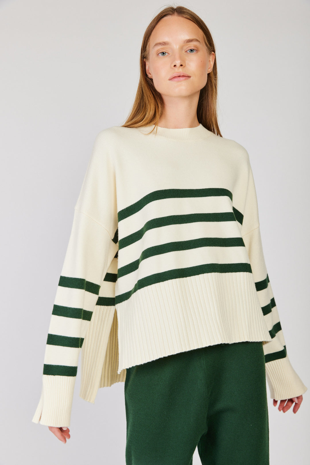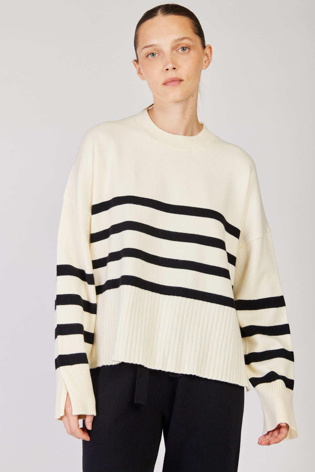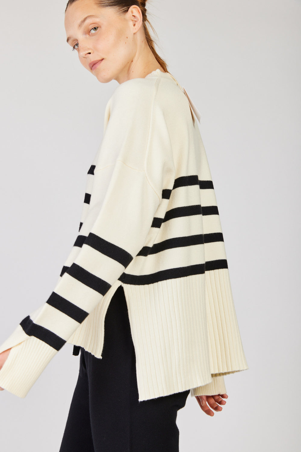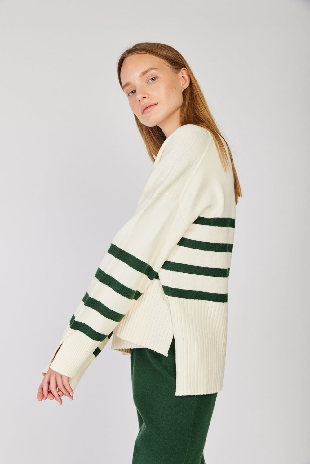 סוודר קוזי מושלם של מותג הבית, רזילי סטודיו. לדגם רוי גזרת אוברסייז רחבה עם ארבעה פסים מדוייקים וסיומות ריב קלאסיות. מדובר בפריט סופר מפנק לימי החורף והוא משתלב מושלם מכנסי ג'ינס או עם טרנינג.