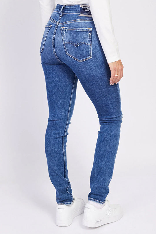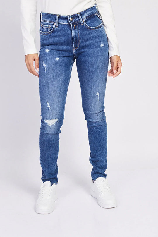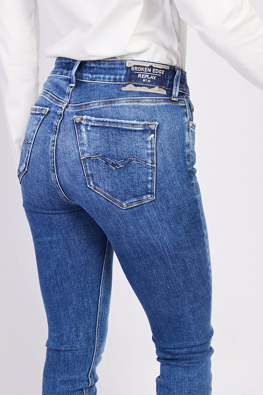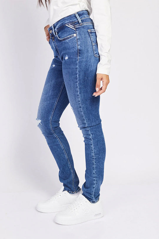 ג'ינס סקיני בגזרה גבוהה עם קרעים קטנים בחזית. לג'ינס סגירת רכיסה בשילוב כפתור בשיבוץ קריסטל. נשים