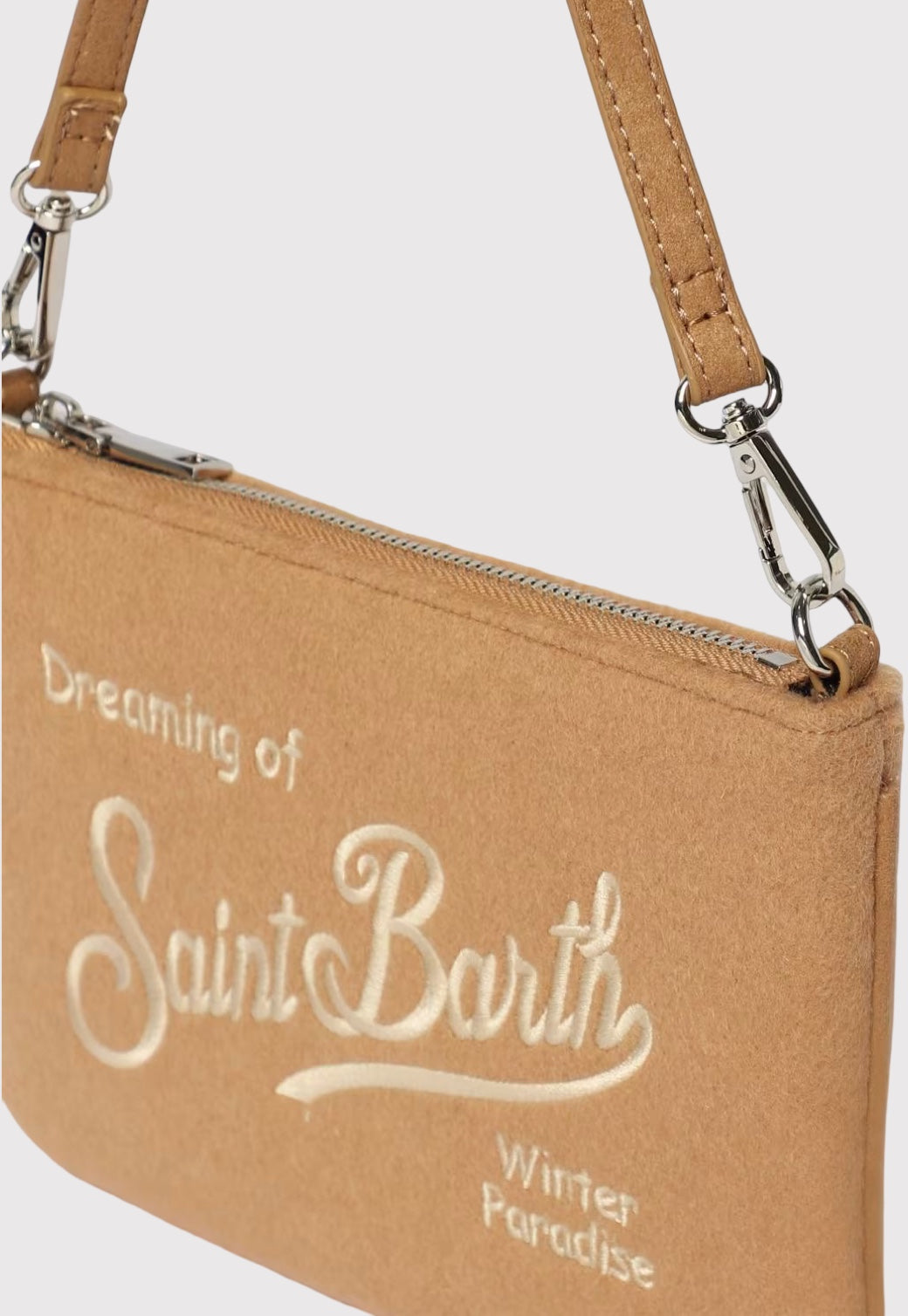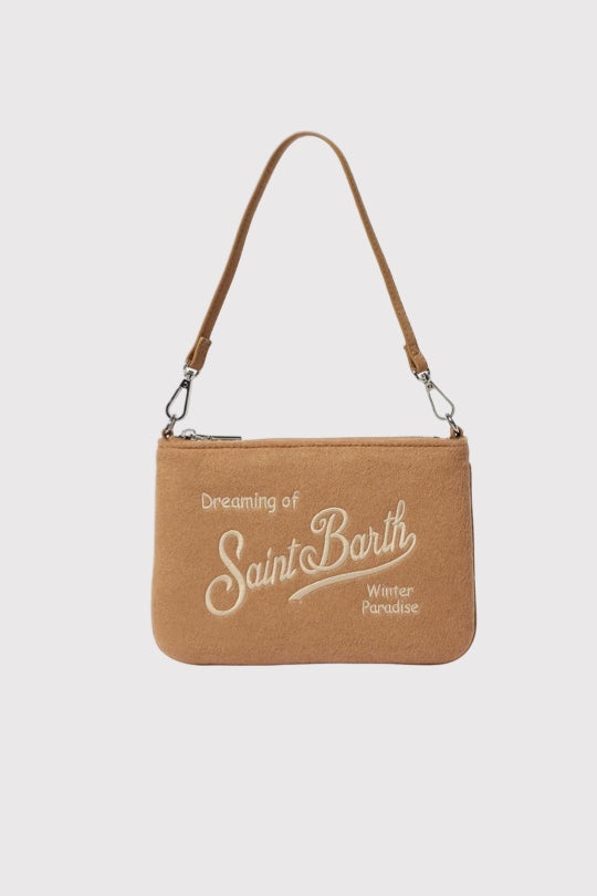 תיק צד קטן בעיצוב רך עם רקמת Saint Barth מלפנים.