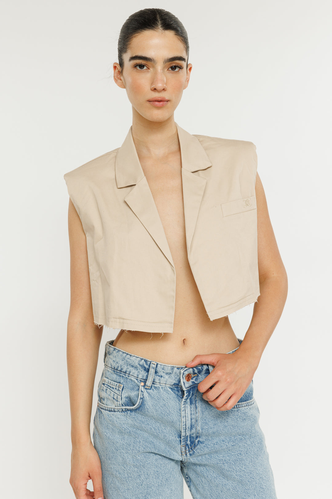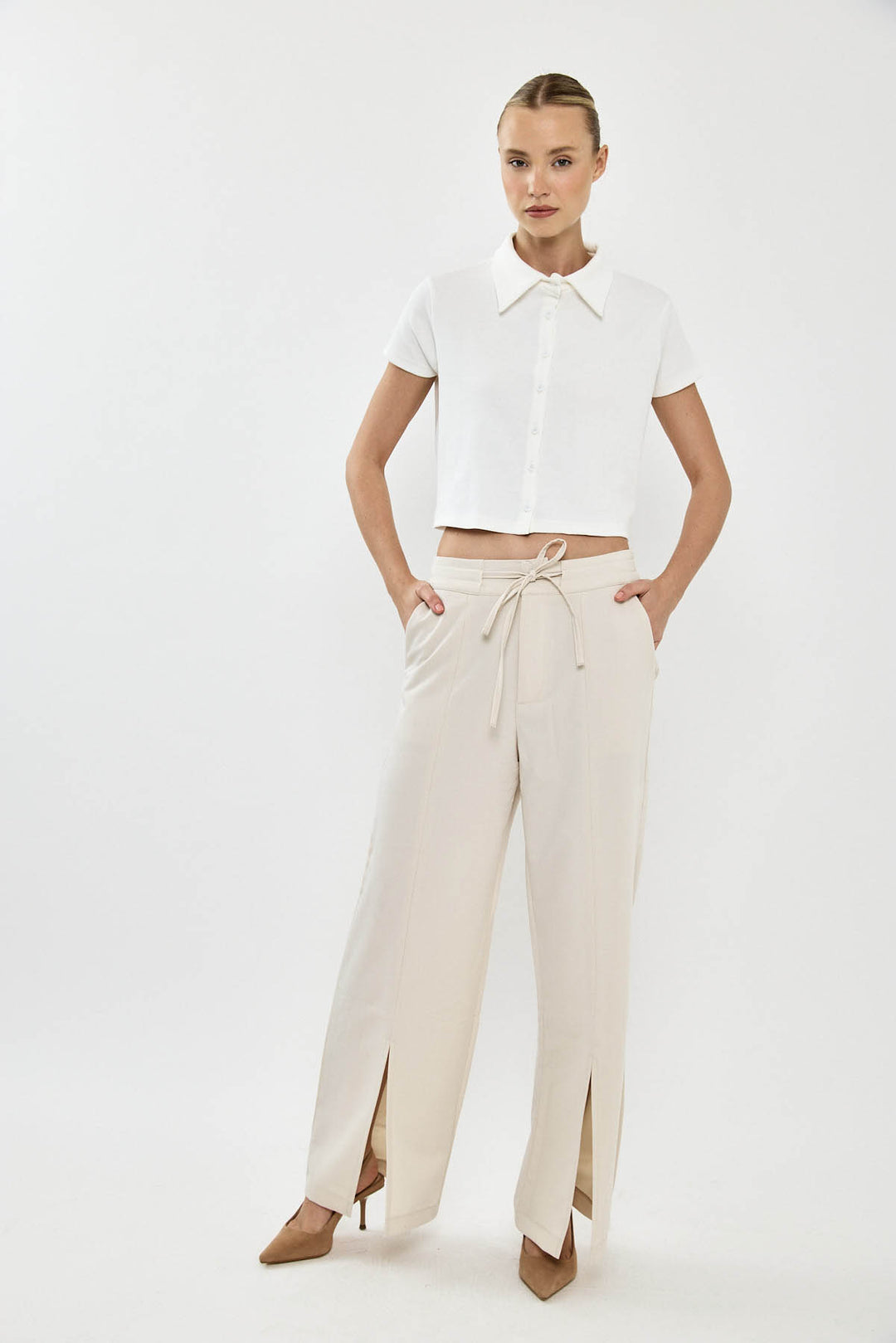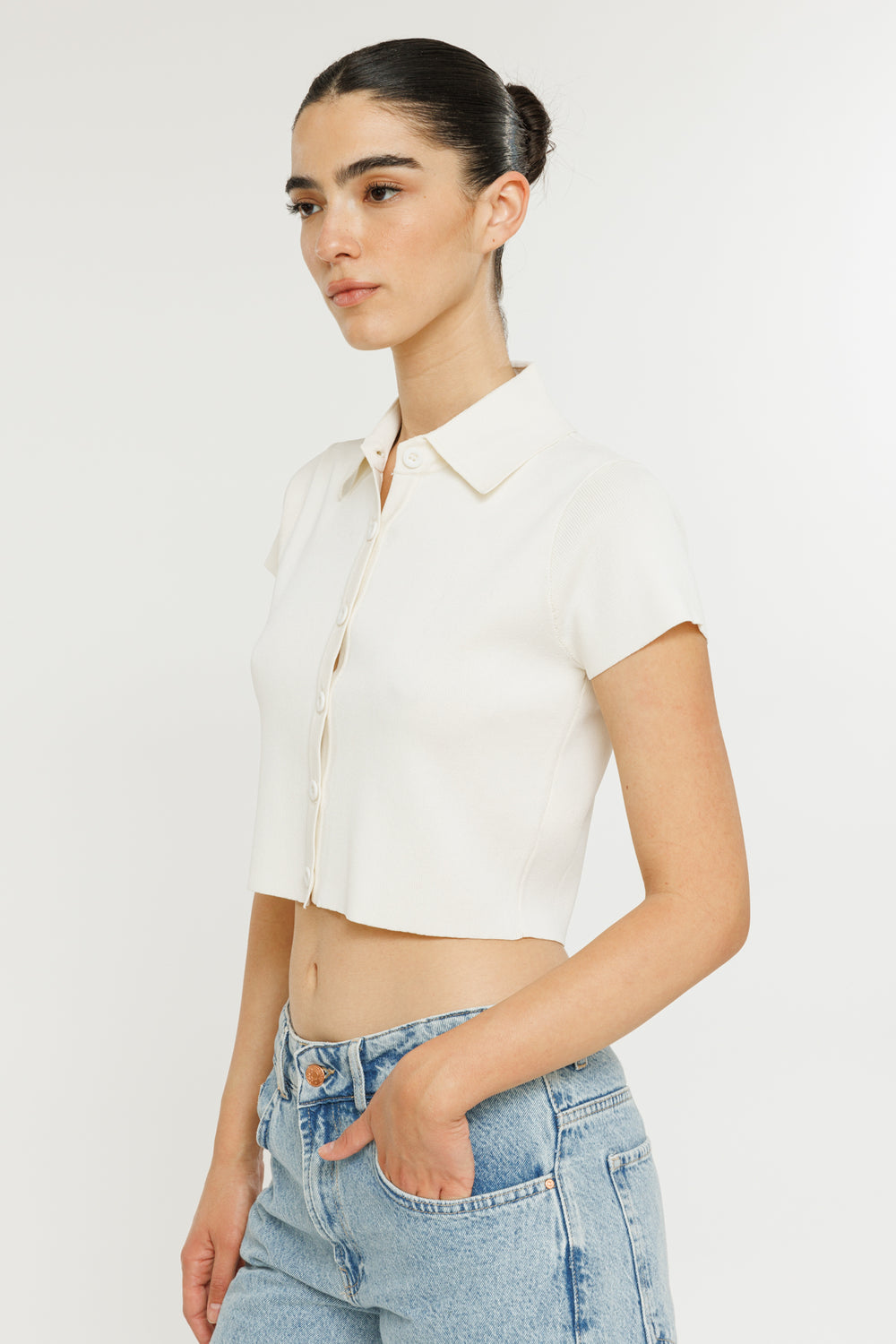 חולצה קצרה מכופתרת Knit Crop בצבע קרם