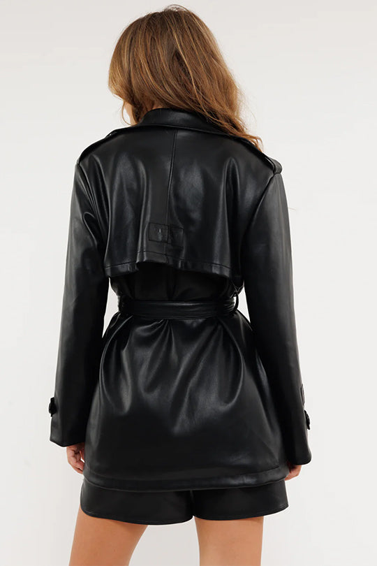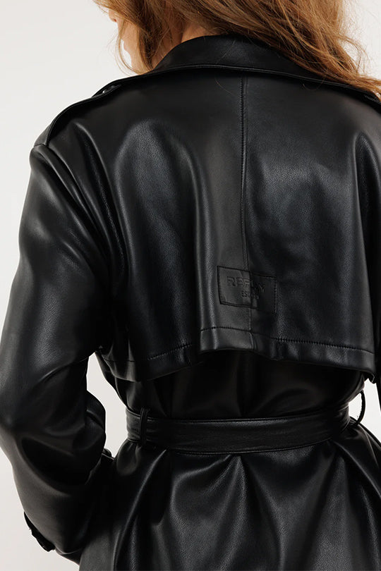 מעיל עור עם חגורה למותן, בעיצוב קלאסי ומוקפד בגוון חום ייחודי. פריט מושלם לשדרוג כל לוק, עם כיסים ותפרים מעודנים שמוסיפים טוויסט עדכני.