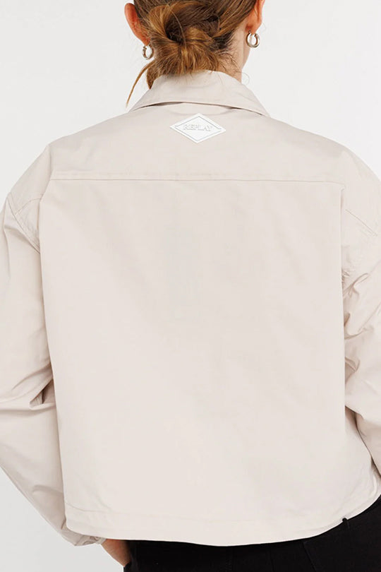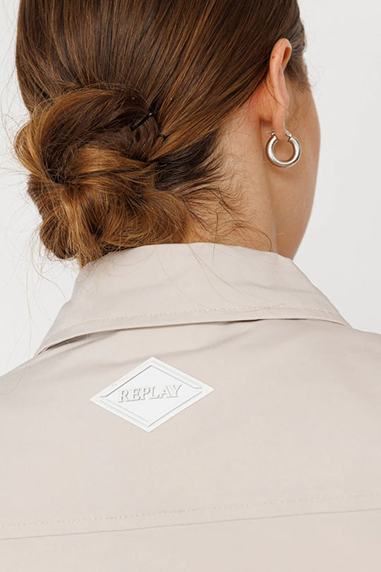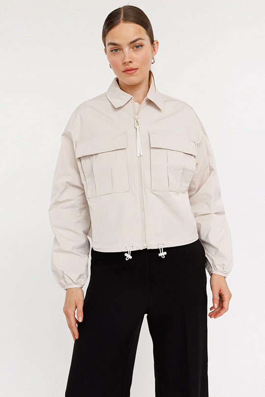מעיל לנשים עם כיסי חזה רחבים. לג'קט שרוך כיווץ במותן. נשים