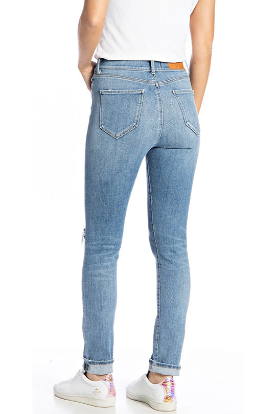 ג׳ינס סקיני בגזרה צמודה ומחמיאה בצבע כחול עם קרעים. עשוי בד גמיש לנוחות מרבית וכולל סגירת רוכסן וכפתור קלאסיים. מתאים לכל לוק – מהמראה היום־יומי עם טי-שירט ועד ללוק ערב עם עקבים וז׳קט. פריט בסיסי ונצחי במלתחה שלך.