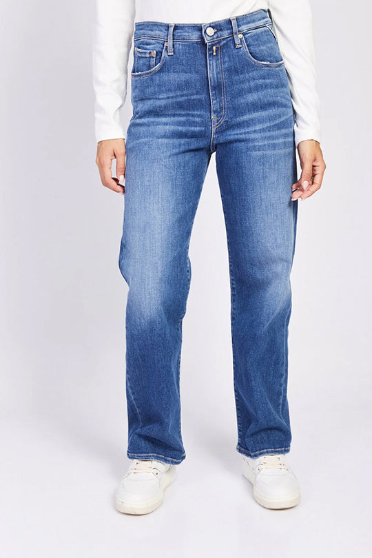 ג'ינס בגזרת רגל רחבה. למכנסיים חמישה כיסים וסגירת רכיסה בחזית. נשים
