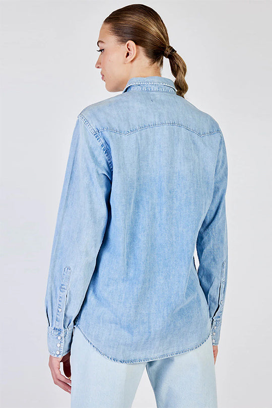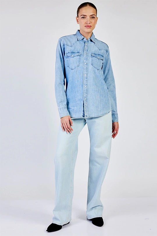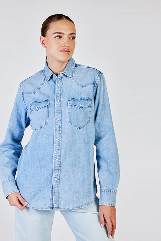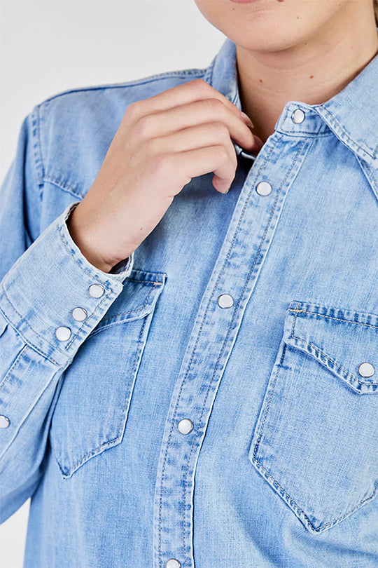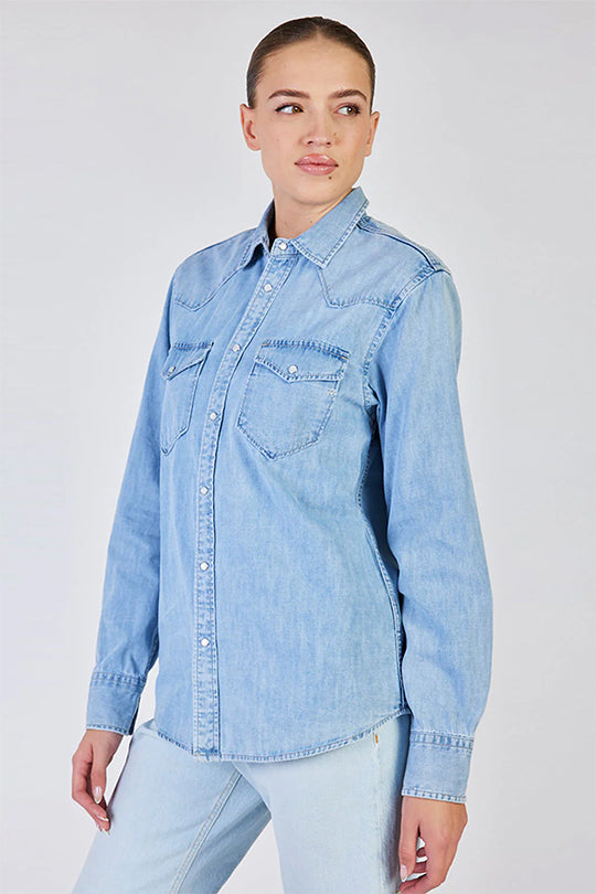 חולצת ג'ינס מכופתרת עם שני כיסי חזה בסיומות מיוחדות. נשים