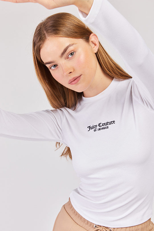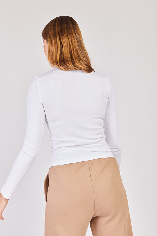 חולצת בייסיק ארוכה בצבע לבן, עם כיתוב בחזית החולצה עם שם המותג.