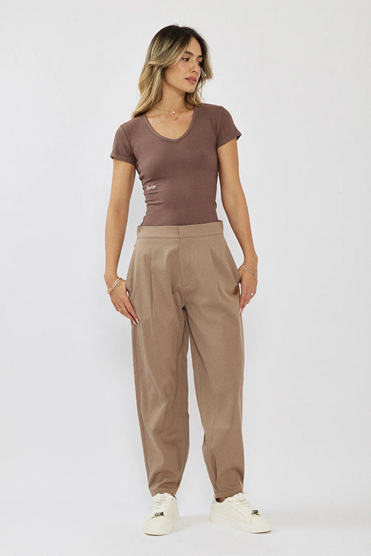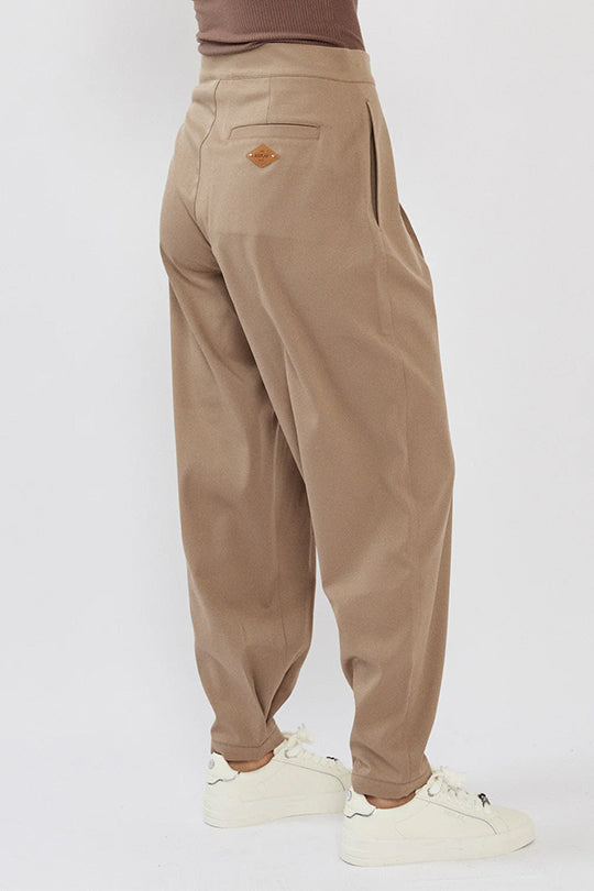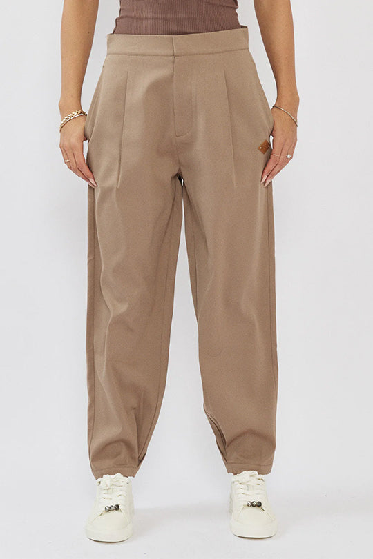 מכנסיים מחויטים לנשים בצבע חום בהיר בגזרת ג׳וגר אלגנטית, עם קפלים קדמיים וגזרה מחמיאה שמעניקה מראה מוקפד אבל נוח. עשויים בד אריג נעים עם נפילה יפה, ומתאימים ליום עבודה, ליציאה או ללוק קז׳ואל יוקרתי עם סניקרס.