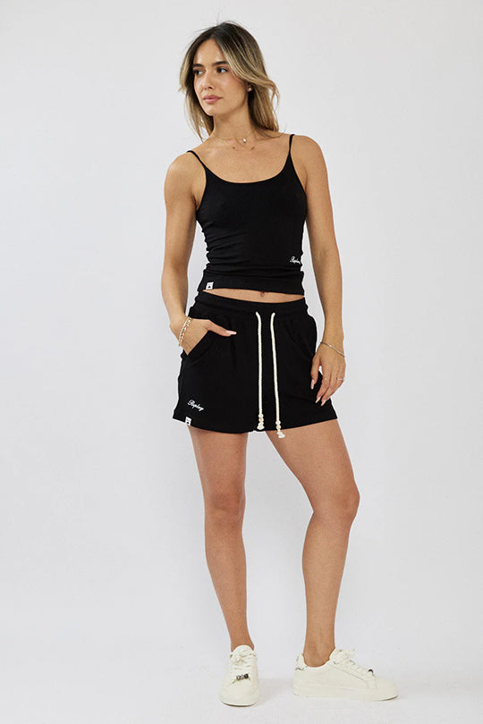 גופיית ספגטי לנשים בצבע שחור בעיצוב נקי ומינימליסטי. עשויה מבד כותנה עם אלסטיין למגע רך וגמישות נוחה לאורך כל היום. הדגם כולל כתפיות דקות וגזרה צמודה המחמיאה לגוף. לוגו קטן בתחתית החזית מוסיף טאץ' עדין ומדויק. משתלבת בקלות עם ג'ינס, מכנסיים קצרים או חצאית ללוק קז'ואלי ונוח.