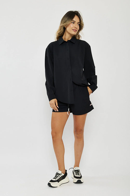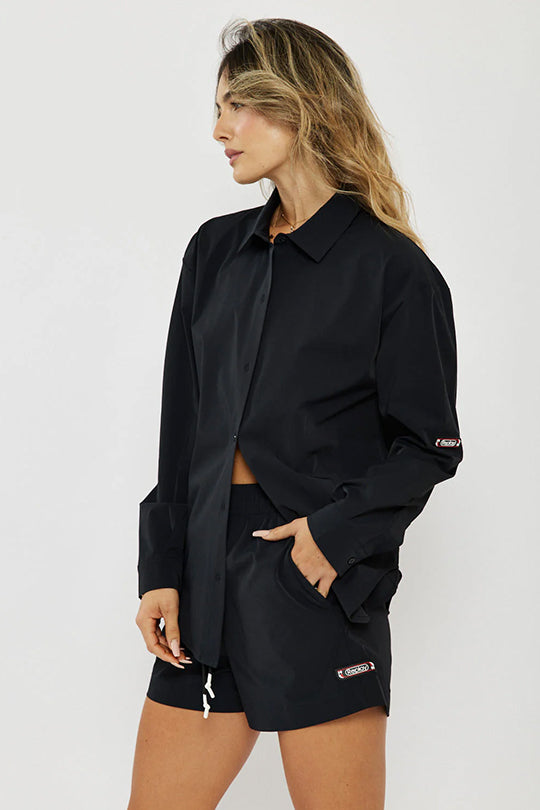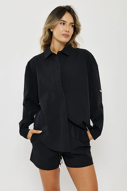 חולצה מכופתרת לנשים בצבע שחור בעיצוב אלגנטי ונקי שמתאים לכל שעות היום.