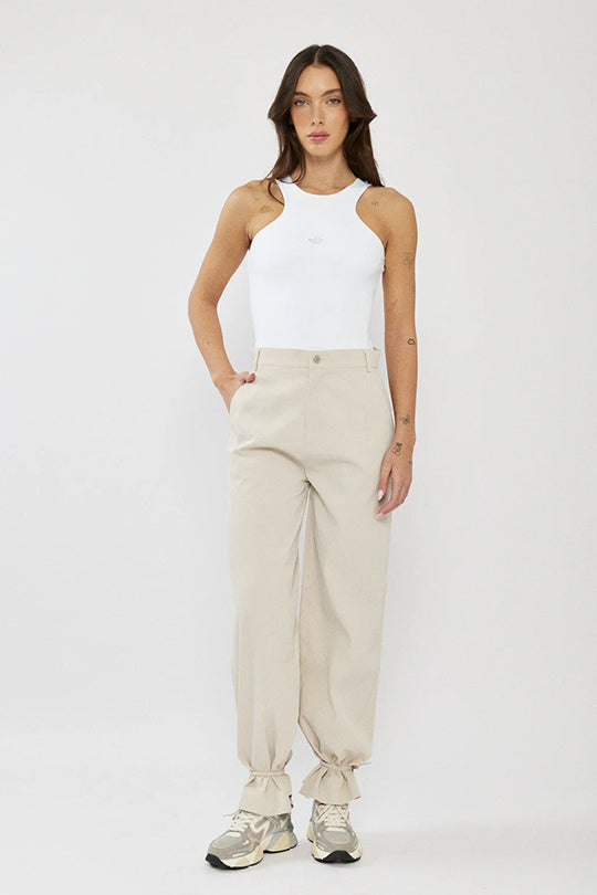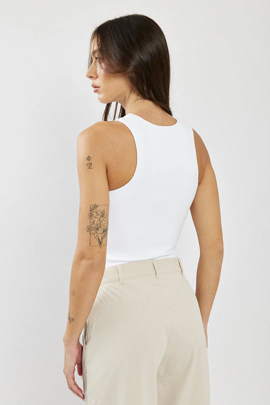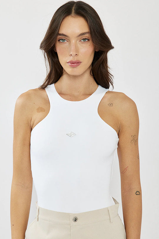 גופייה צמודה לנשים בצבע לבן בעיצוב נקי ומחמיא, עם מפתח צוואר גבוה בסגנון ספורטיבי שמדגיש את הכתפיים ויוצר מראה מודרני ומדויק. עשויה בד רך ונעים עם מתיחה קלה להתאמה מושלמת לגוף.