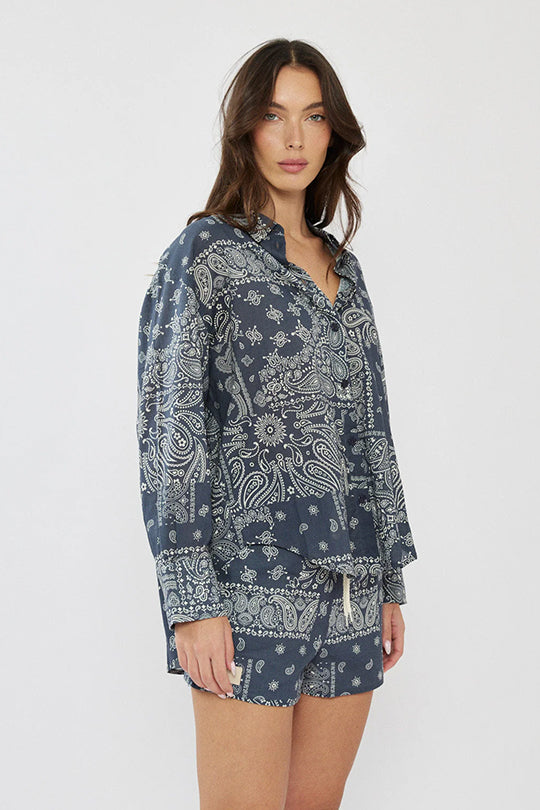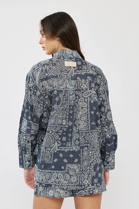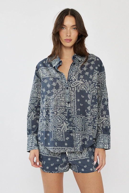 חולצה מכופתרת לנשים בצבע כחול עם הדפס פייזלי ייחודי, בעיצוב קז’ואלי-אופנתי שמתאים ללוק קייצי מושלם.
