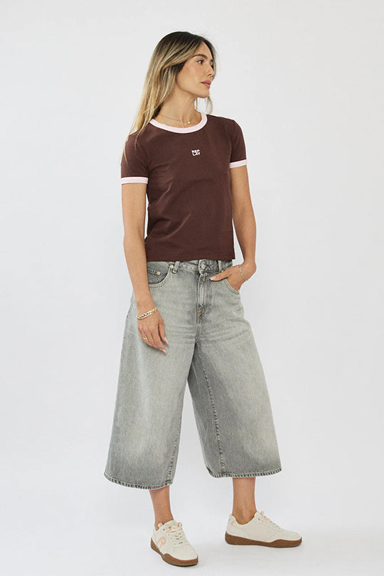 טי-שירט רינגר לנשים בצבע חום בעיצוב קלאסי ומחמיא, עם שוליים בהירים בצוואר ובשרוולים שמוסיפים טאץ׳ וינטג׳ נקי ומדויק. עשויה בד כותנה רך ונעים ללבישה יומיומית, בגזרה מחמיאה שמתאימה לכל שילוב.