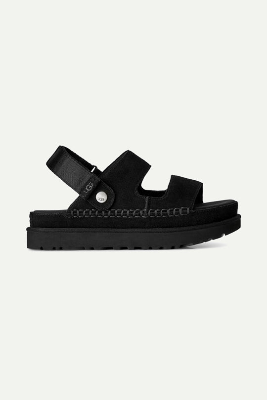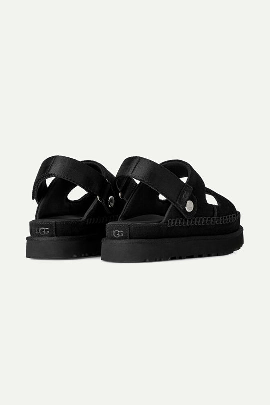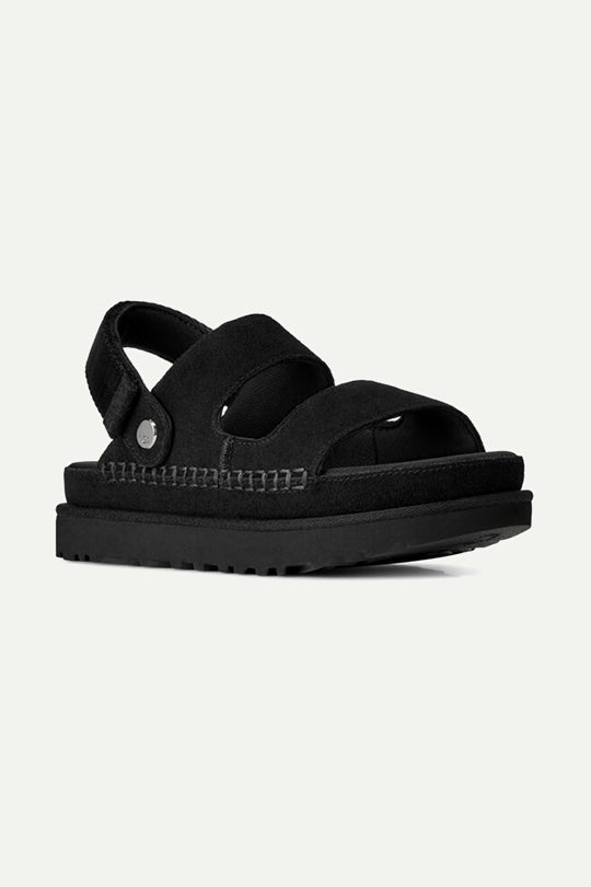 פכפי פלטפורמה בצבע שחור בעיצוב מודרני עם טאץ’ מחוספס ועדכני. הדגם עשוי זמש רך למגע וכולל רצועה רחבה עם אבזם מתכתי להתאמה אישית ולמראה ייחודי. תפרי הדגשה היקפיים מוסיפים עניין ועומק לעיצוב הכולל