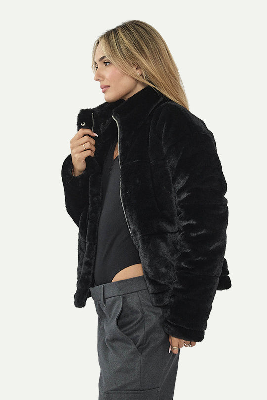 מעיל קצר לנשים עשוי פרווה סינתטית רכה ונעימה למגע בגוון שחור עמוק. כולל רוכסן קדמי מלא עם דש כפתורי לחיצה, צווארון גבוה מחמם וכיסי צד נסתרים. גזרה מעט רחבה לנוחות ושכבות, בטנה נעימה לשעות הקרות ומראה אלגנטי שמתאים גם ליום־יום וגם לערב.