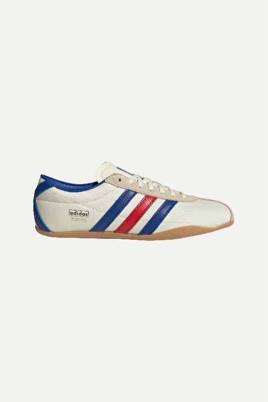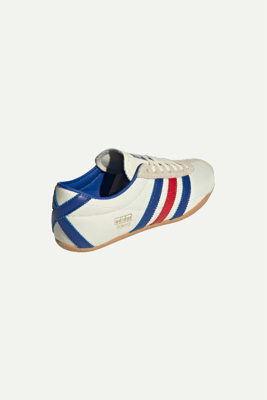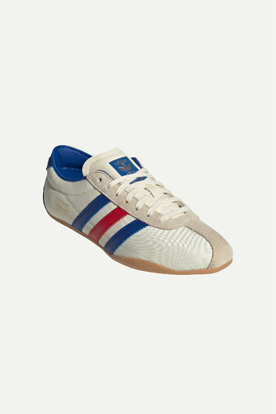 נעלי סניקרס קלאסיות בעיצוב רטרו עם פסי כחול ואדום וסוליית גומי חומה. שילוב מושלם של נוחות ואופנה עם טאץ’ וינטג’ אורבני.