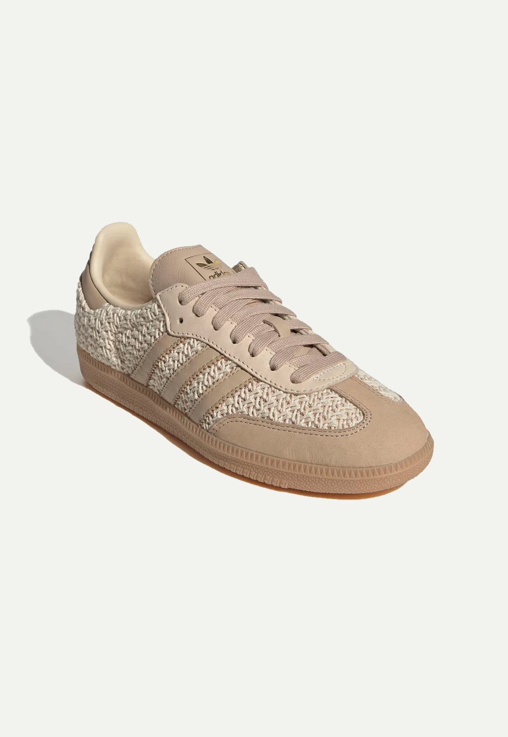 נעלי adidas Samba OG בגוון טבעי עם שילוב זמש ובד סרוג טקסטורלי בצדדים. שלושה פסים תואמים ולוגו מוזהב מוסיפים מראה קלאסי, וסוליית גומי חומה משלימה את הסטייל האייקוני.