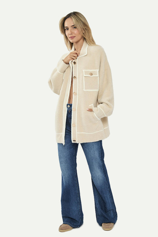 חולצת סריג רך בסגנון טדי, בגזרת רילקס ונעימה לשכבות. סגירת כפתורים קדמית, צווארון קלאסי, שני כיסי חזה עם כפתור ועוד שני כיסים אלכסוניים בצדדים. גימורי פסי קונטרסט בהירים שמדגישים את החיתוכים ומראה נקי ומעודן. שכבת מעבר מחממת שמתאימה לג׳ינס ולמכנסיים בגווני ניוד.