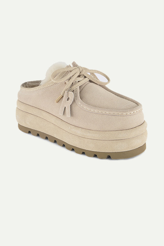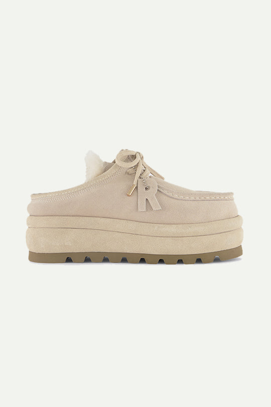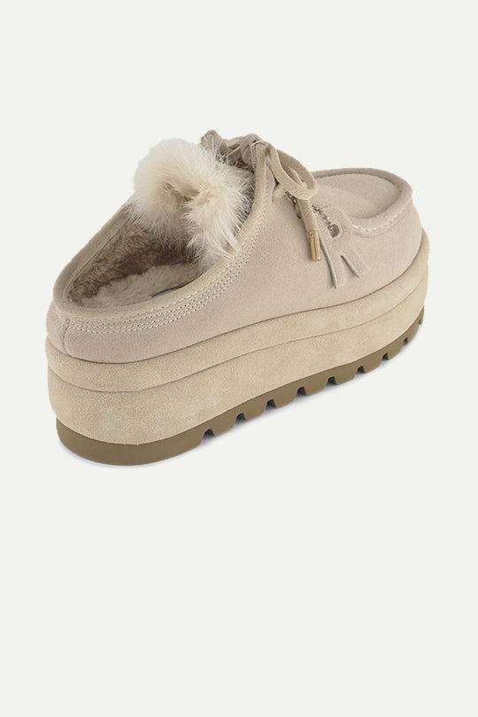 כפכפי פלטפורמה לנשים בעיצוב מוקסין מודרני בגוון בז׳ רך ונקי. עשויים דמוי זמש איכותי עם בטנת פרווה פנימית חמימה ונעימה למגע. סוליית הפלטפורמה הגבוהה והמוחלקת מעניקה מראה אופנתי ונוחות מירבית, עם תחתית גומי מחורצת לאחיזה יציבה. השרוכים הדקורטיביים והאות R בצד משלימים את הלוק האלגנטי והחורפי. אידיאליים לשילוב עם ג'ינס או שמלה קצרה למראה חורפי מלא סטייל.