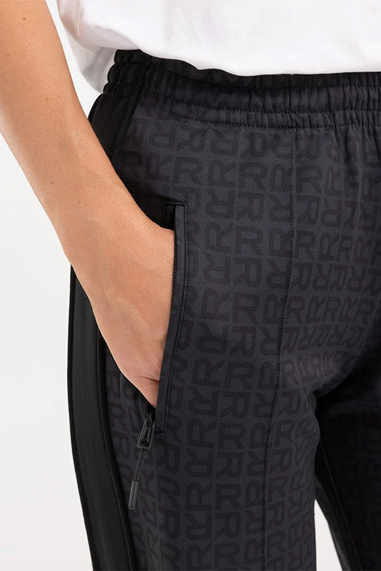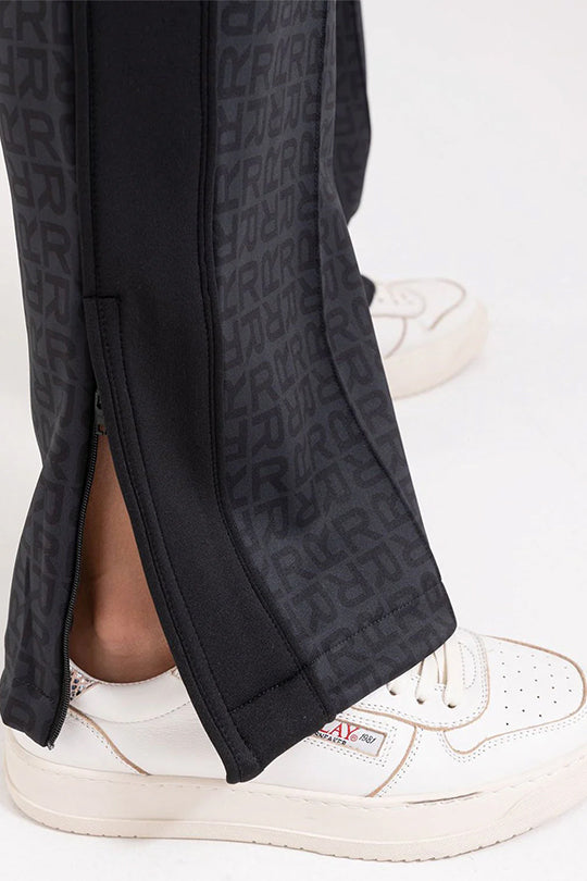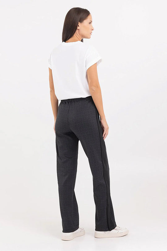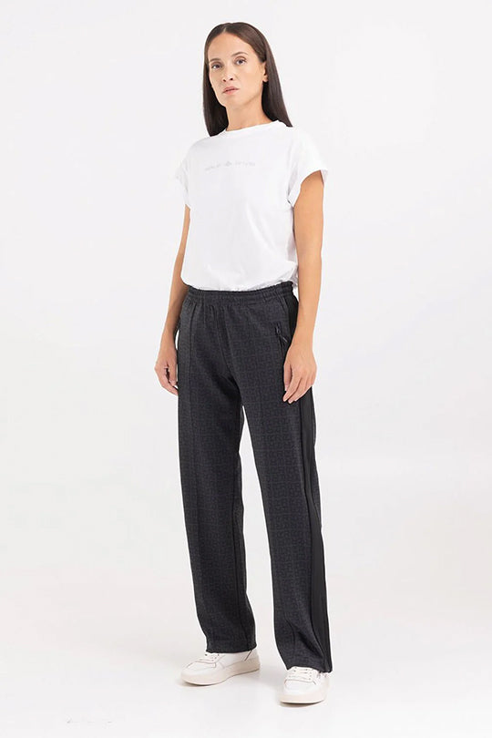 טרנינג בגזרה ישרה עם כיסים צידיים מרוכסנים. למכנסיים פסים שחורים לאורך צידי הרגליים ורוכסנים נסתרים בקרסוליים. לטרנינג דוגמנת לוגו מונוגרם אול אובר. נשים