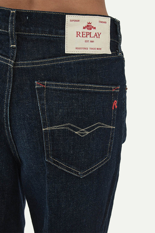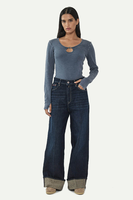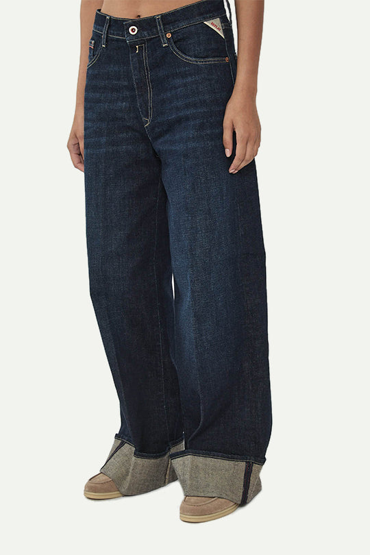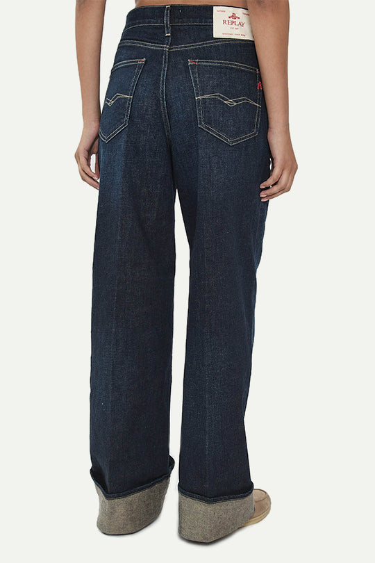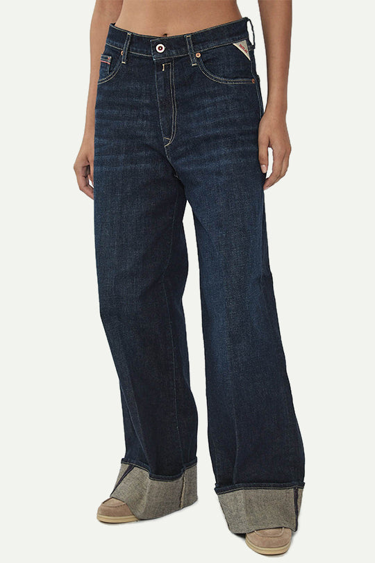 ג'ינס לנשים בגזרה רחבה ומעודכנת עם קיפול רחב בקצה הרגליים למראה אופנתי. עשוי דנים כותנה איכותי בגוון כחול כהה עם שטיפה עדינה. כולל סגירת כפתור ורוכסן, לוגו קטן על כיס קדמי ותפרים קונטרסטיים המוסיפים טאץ' קלאסי. מושלם לשילוב עם חולצה תחובה או סוודר קל למראה קז'ואל מתוחכם.