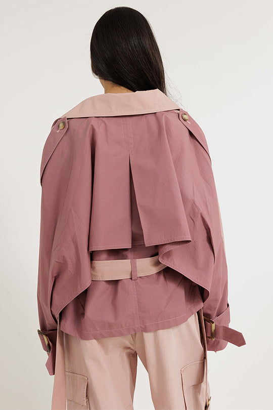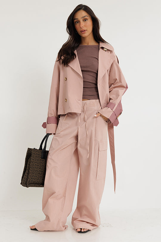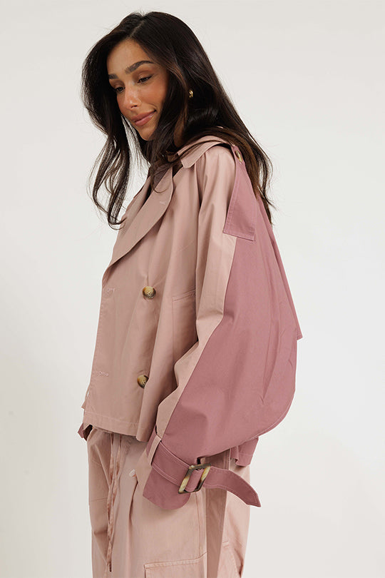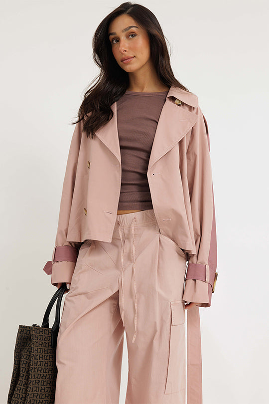 ג'קט טרנץ' קצר בגזרה מחויטת עם כפתורים כפולים ורצועות אבזם בשרוולים. עשוי מבד קליל ונוח, עם טאץ' אלגנטי שמתאים ללוק יום-יומי או ערב. ניתן לשלב עם המכנסיים התואמים למראה מתוחכם ומלא סטייל.