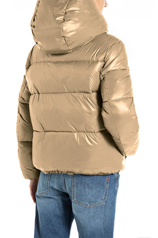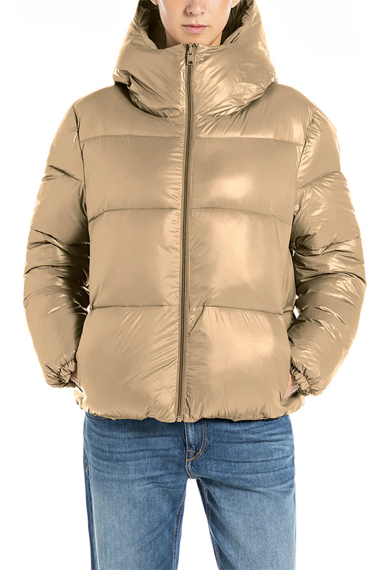 מעיל פוך לנשים בגזרה קצרה ומודרנית, בגוון בז׳ אבן אלגנטי. עשוי מבד מבריק קליל ודוחה רוח, עם מילוי סינתטי איכותי המעניק חימום ונוחות מירבית. כולל רוכסן קדמי מלא, כיסי צד נסתרים וכובע מובנה להשלמת ההגנה מהקור. אידיאלי לימים חורפיים, מעניק מראה נקי, נשי ויוקרתי המתאים לכל סגנון לבוש.