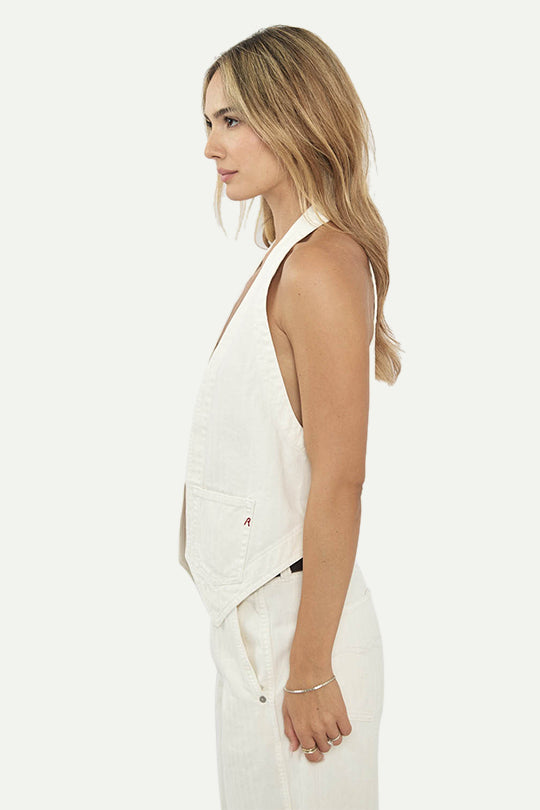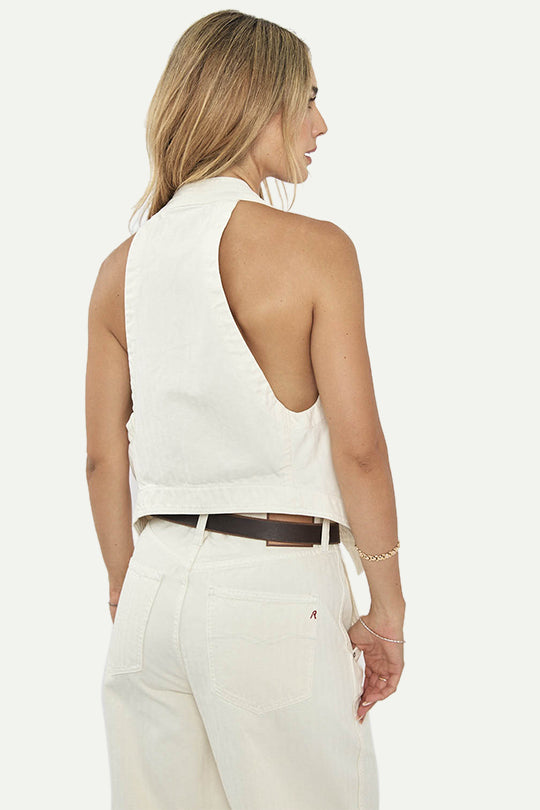 וסט ג׳ינס לנשים בגזרת צווארון עמוק בסגנון מחויט עם שני כיסים קדמיים. עשוי בד כותנה איכותי עם מגע רך ונעים, בגוון שמנת קלאסי שמעניק מראה אלגנטי ובו בזמן קליל. ניתן לשלב מעל חולצה או ללבוש כשכבה עליונה למראה ייחודי ומעודכן.