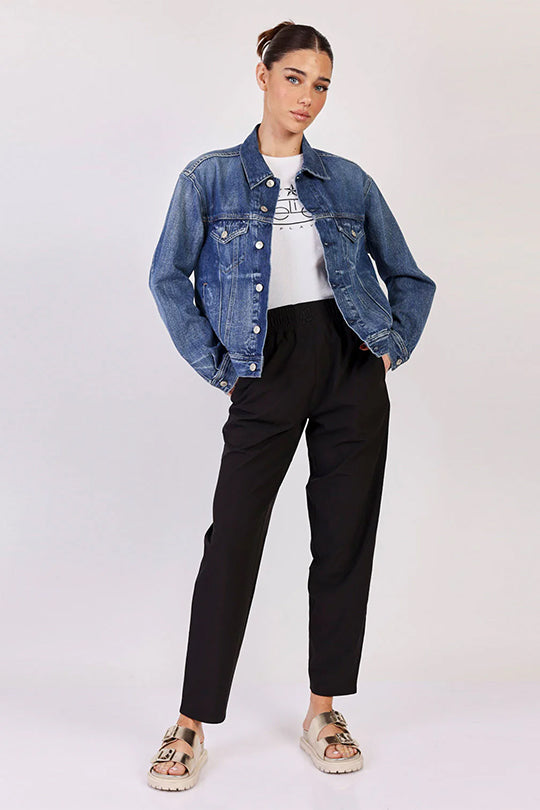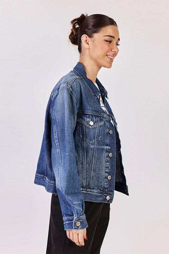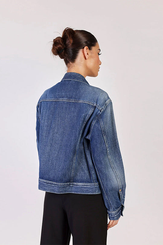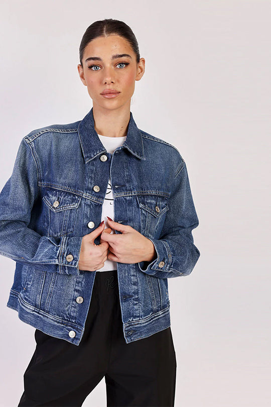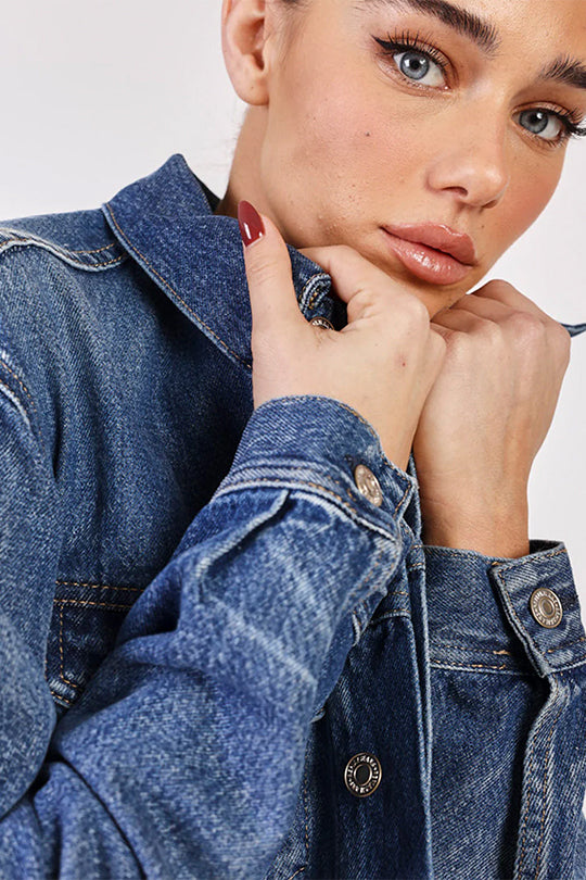 ג'קט ג'ינס קלאסי לנשים. לג'קט סגירת כפתרה ושני כיסי חזה. נשים