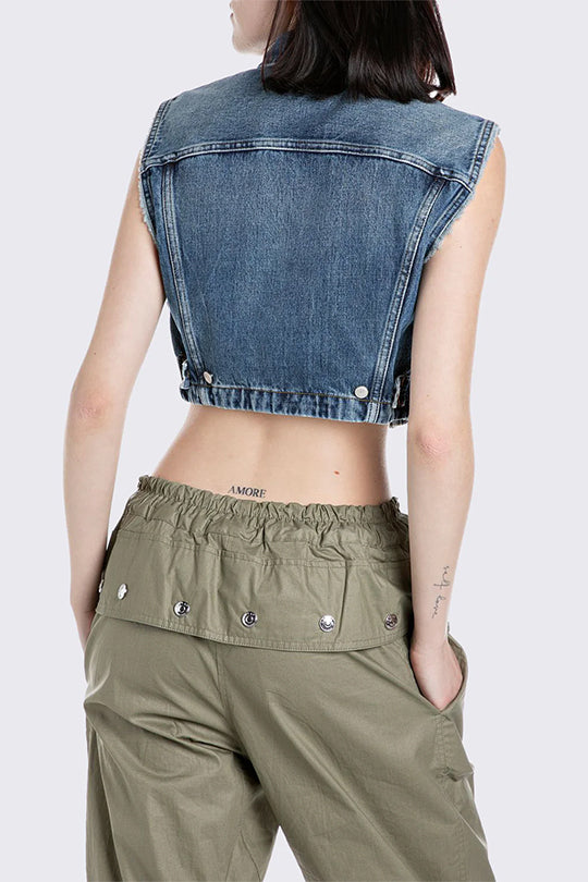 וסט ג’ינס לנשים בגזרה קצרה עם מראה רטרו-מודרני מדויק. עשוי מבד ג’ינס איכותי עם שטיפה בהירה, כולל כיסים קדמיים עם כפתורים מתכתיים ולוגו קטן של Replay. הוסט מעניק טאץ’ אופנתי לכל לוק – מעל טי-שירט, שמלה או גופייה.
