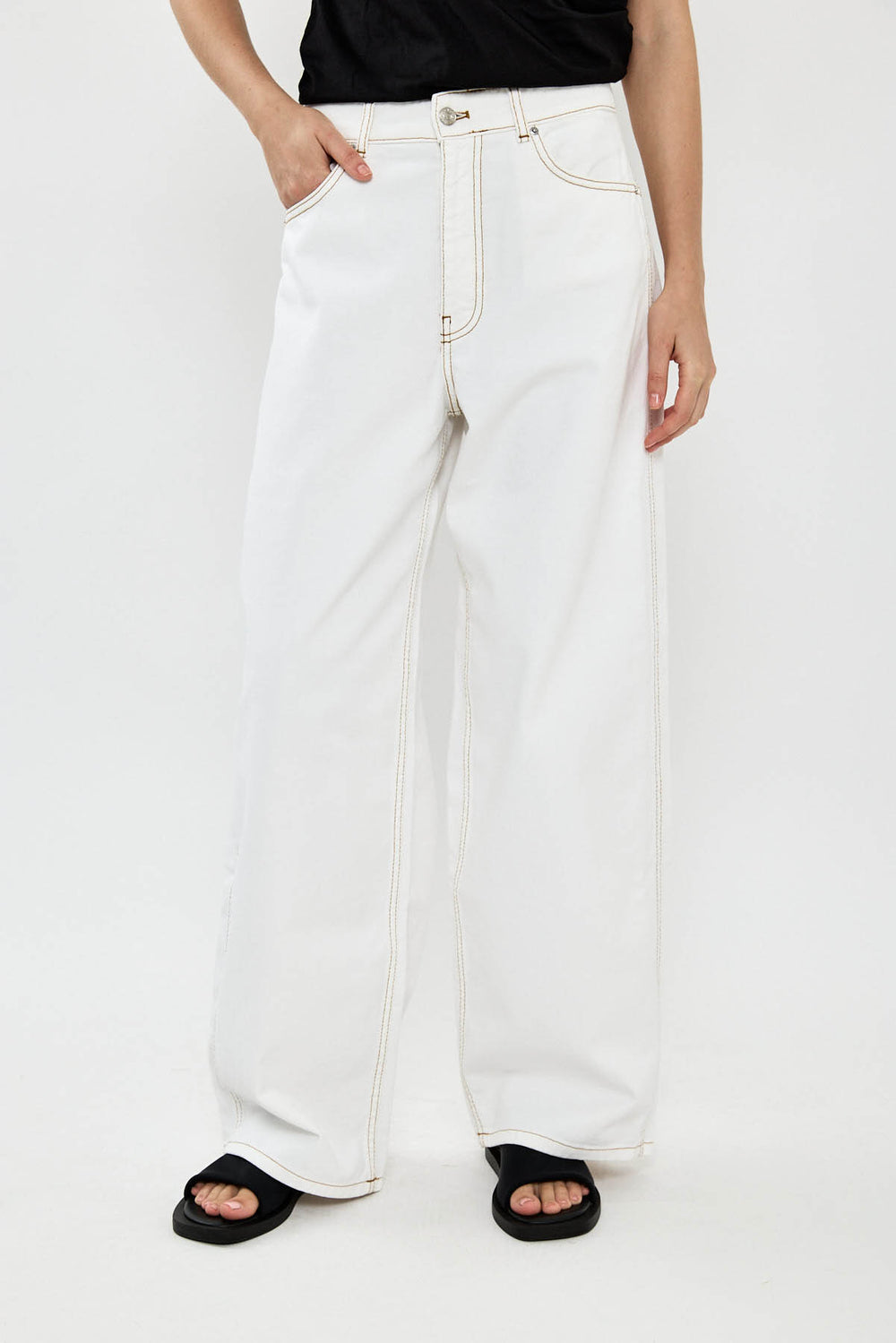מכנסיים בגזרה רחבה עם מותן גבוהה וסגירת רוכסן וכפתור. עשויים מבד עבה ועמיד בגוון טבעי עם תפרים מודגשים ליצירת מראה ייחודי ומחוספס. כיסים קדמיים ואחוריים להשלמת הלוק הקז'ואלי.