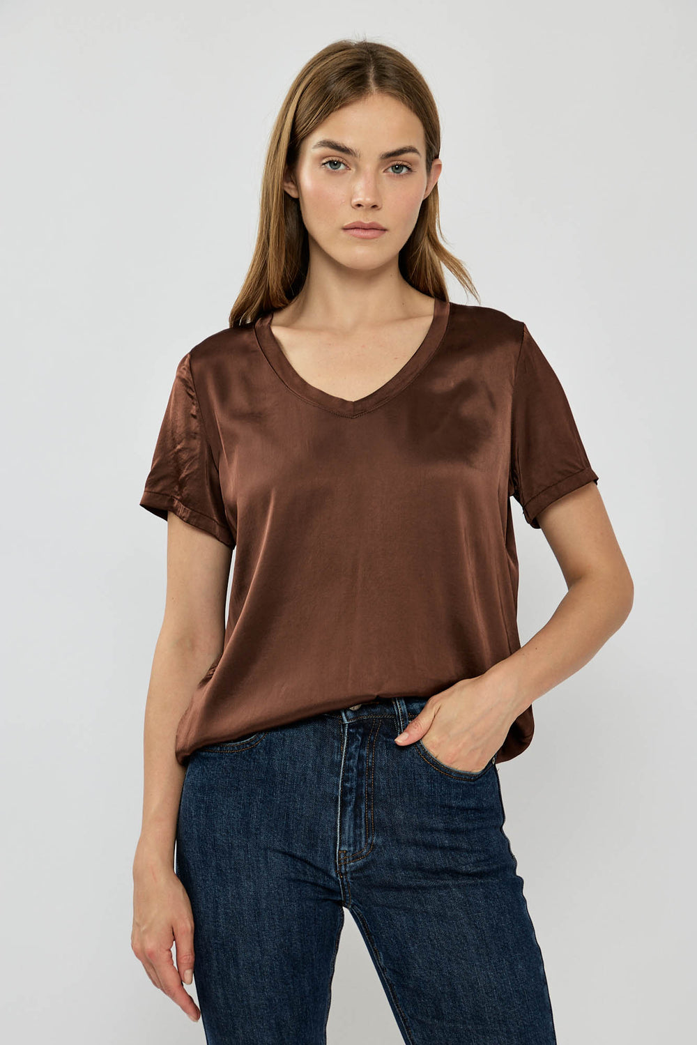 חולצת טי נשית עם מחשוף V מחמיא, עשויה מבד סאטן חלק בגוון ירוק פסטלי רך. משלבת בין אלגנטיות לנוחות יומיומית, ומתאימה לשילוב עם ג'ינס, חצאית או מכנס מחויט ליצירת לוק קליל אך מלא סטייל.