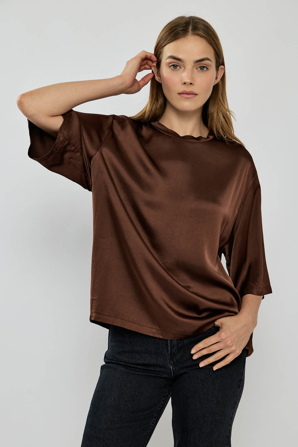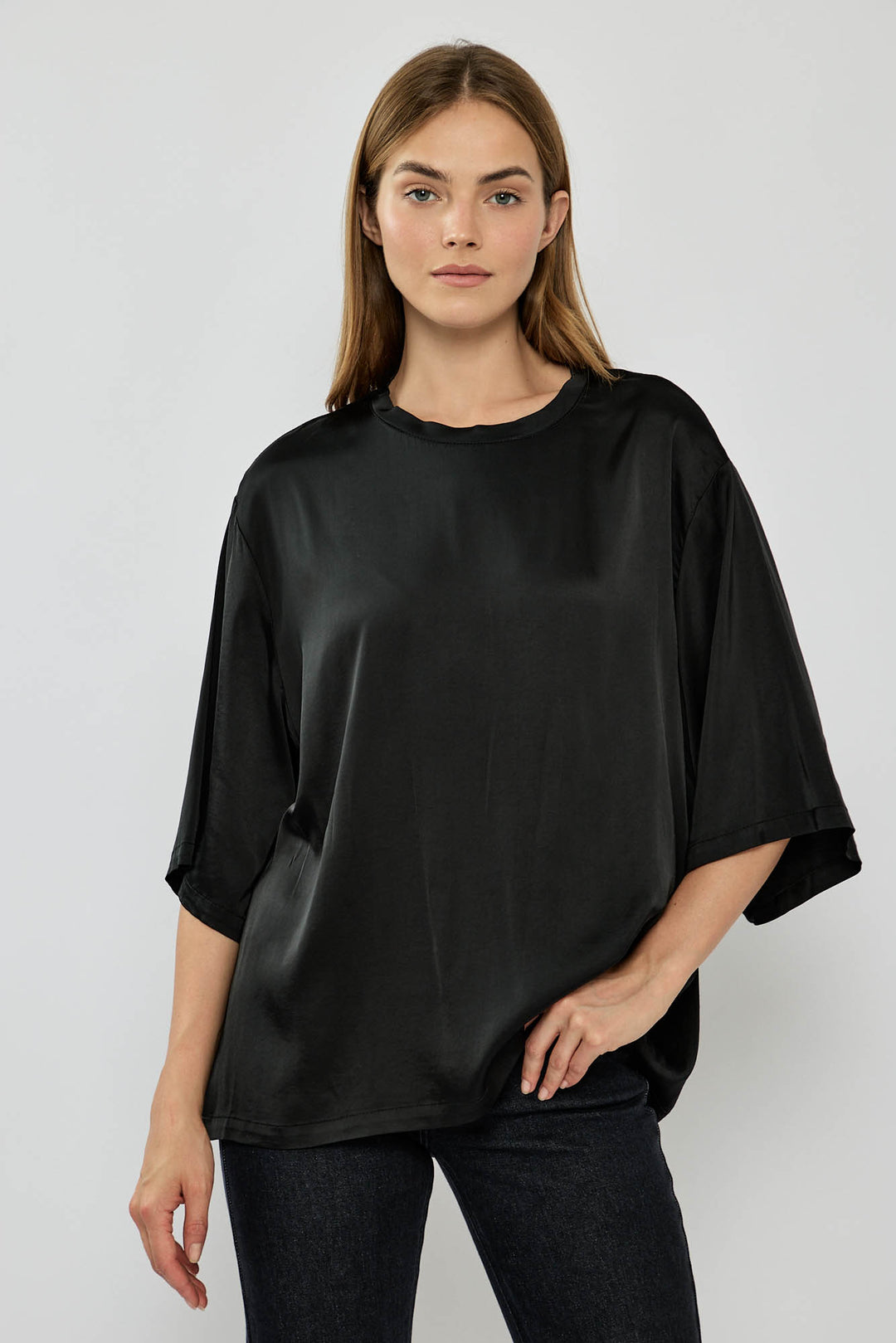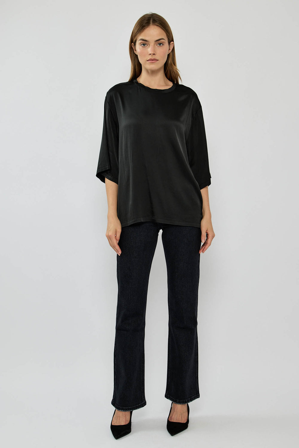 חולצת טי מבד סאטן רך ונשפך בגוון כחול עמוק. בעלת מפתח עגול, שרוולים באורך מרפק וגזרה משוחררת ונינוחה – מראה אלגנטי עם טאץ’ מחויט.
