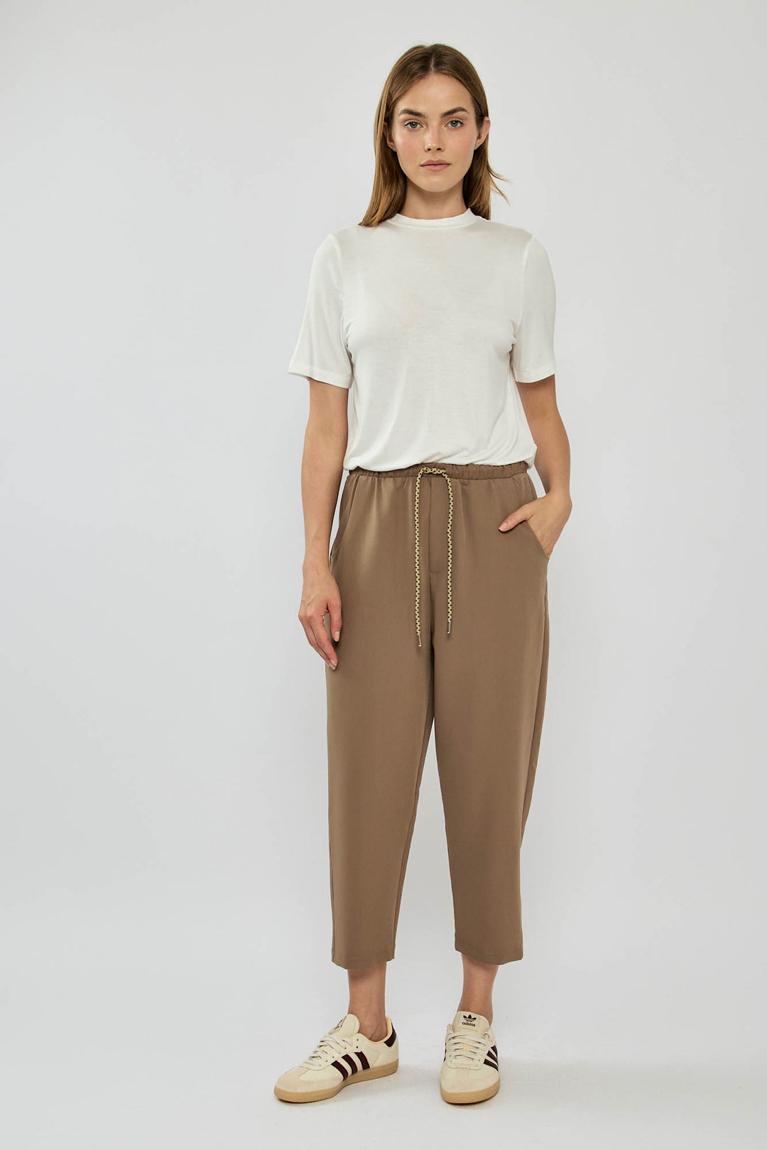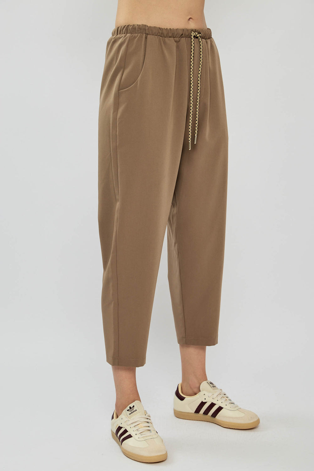 מכנסיים בגזרת 7/8 נינוחה בצבע שחור קלאסי, עם גומי במותן ושרוך קשירה צבעוני להשלמת הלוק. מתאימים ליום-יום או לשילובים קז'ואליים מלאי סטייל.