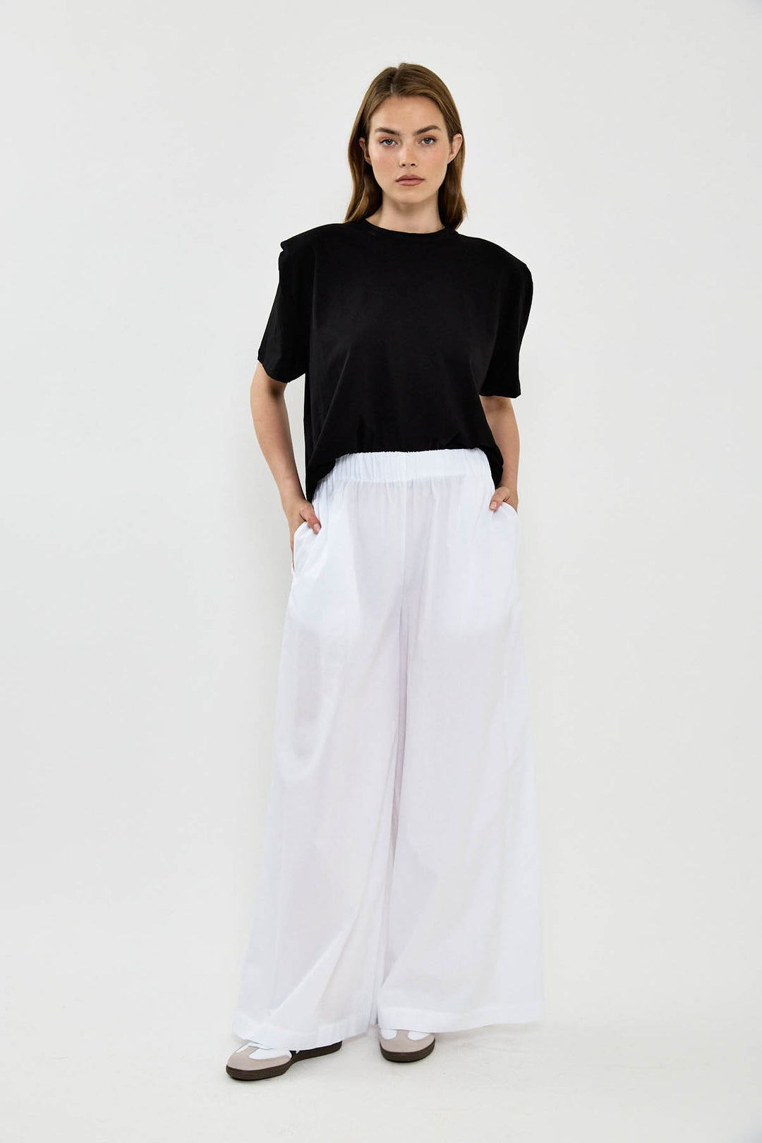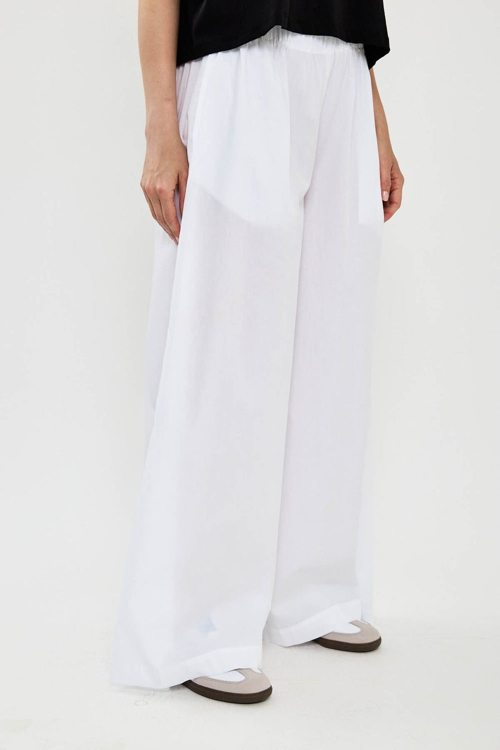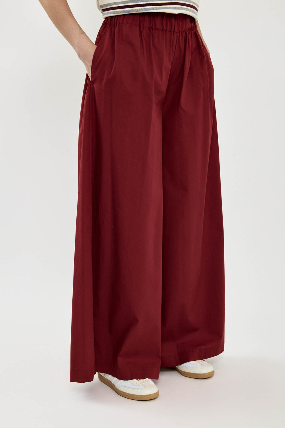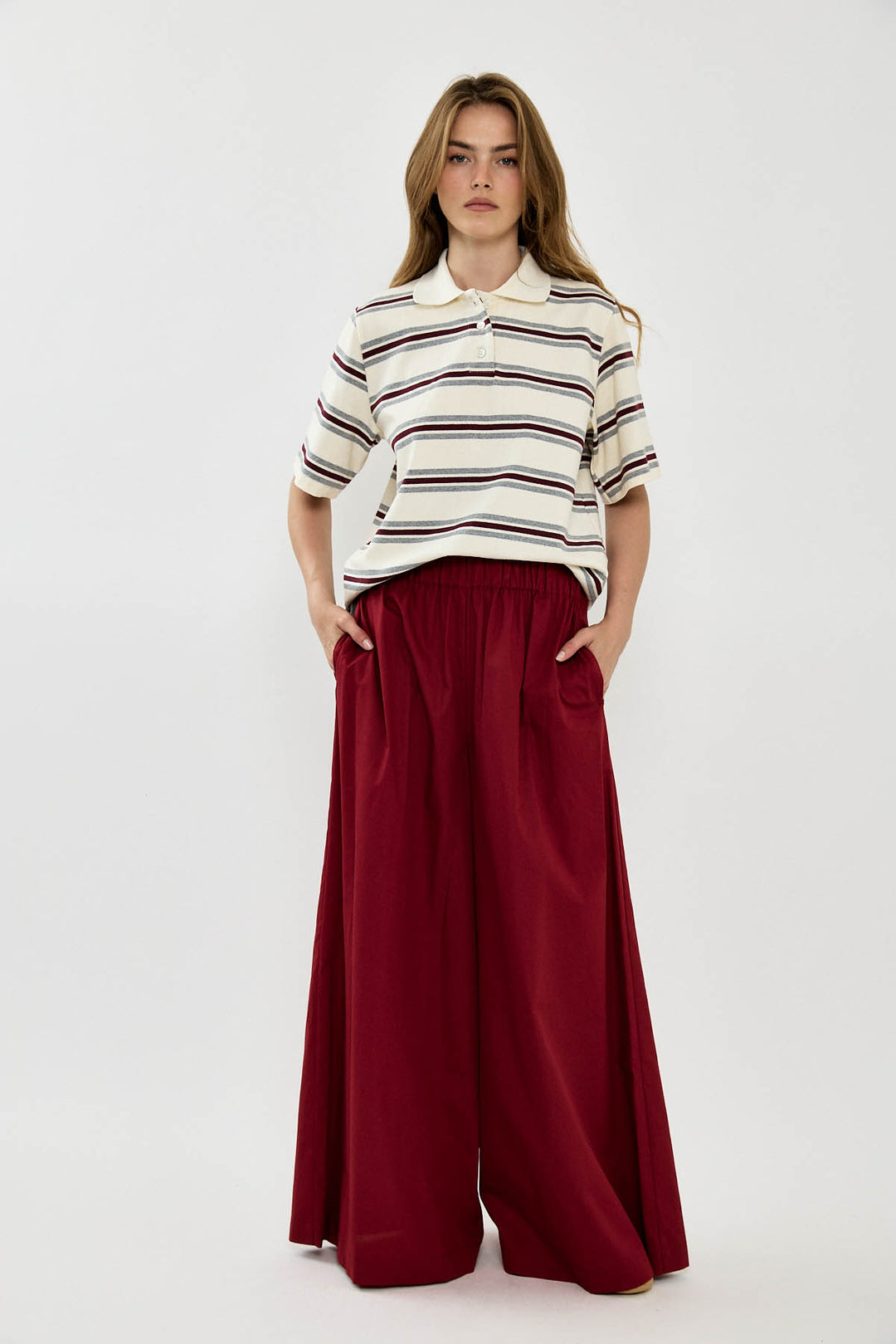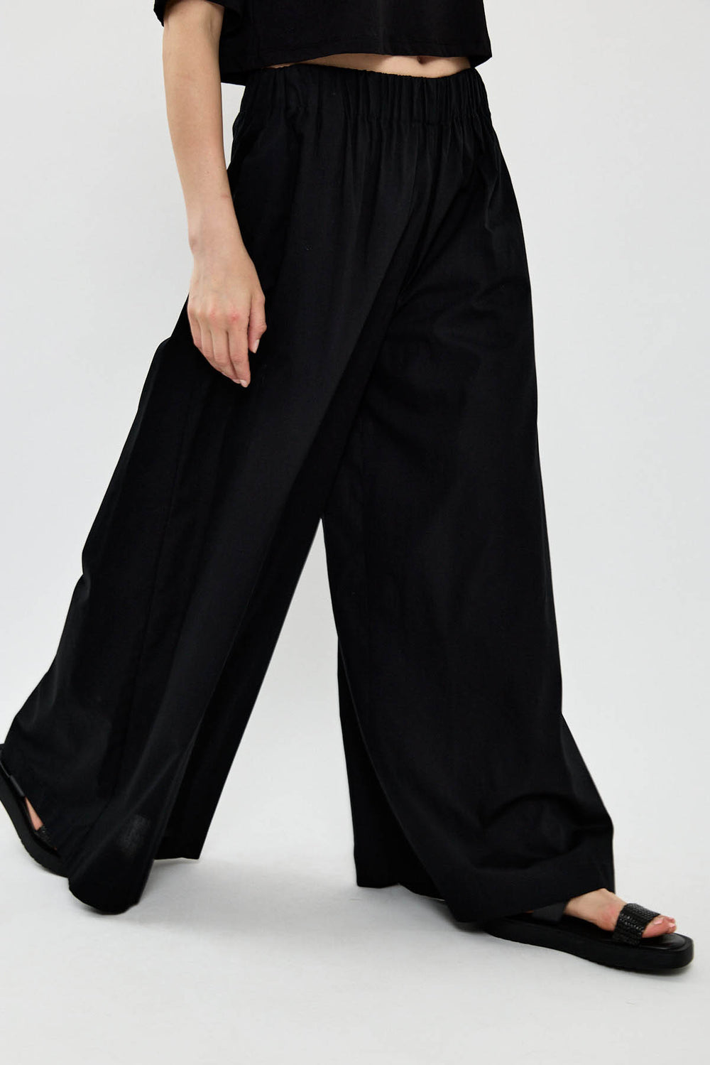 מכנסיים רחבים ונשפכים בגזרה גבוהה עם מותן אלסטית נוחה להתאמה מירבית. עשויים מבד קליל ואוורירי המעניק מראה נשי וזורם. הדגם כולל קפלים עדינים שיוצרים תנועה רכה ומחמיאה.