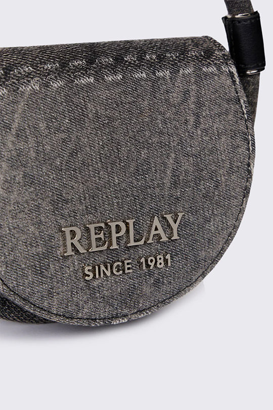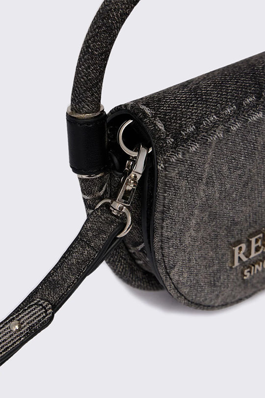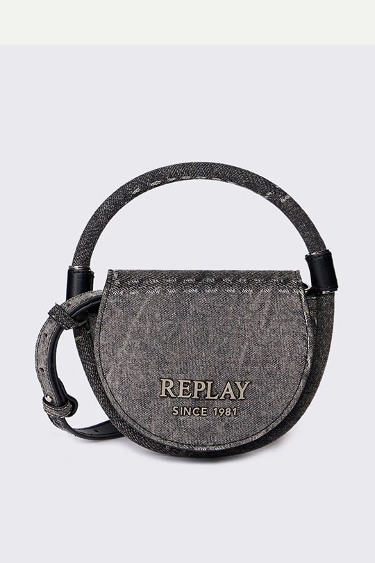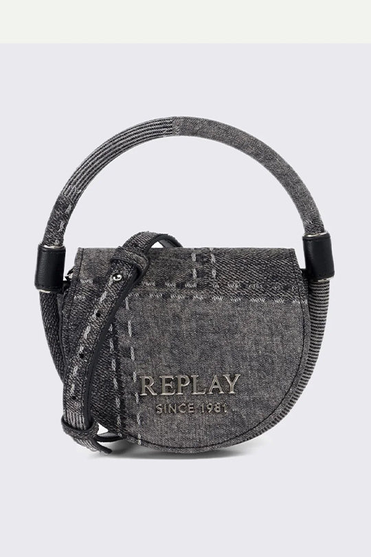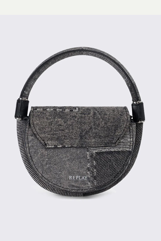 תיק יד לנשים בעיצוב עגול ומעודן, עשוי בד דמוי ג׳ינס עם ידית עליונה ורצועה צדית דקורטיבית. לוגו מתכתי בחזית למראה יוקרתי ואורבני. מושלם לשילוב ביום או בערב.