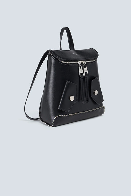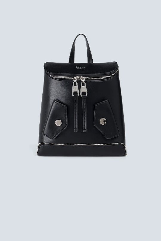 תיק גב לנשים בעיצוב מודרני בצבע שחור, עשוי דמוי עור איכותי עם רוכסן עליון דו־כיווני ודיטיילים מתכתיים. כולל כיסים קדמיים מעוצבים, רצועות כתף מתכווננות וידית נשיאה עליונה – מושלם לשימוש יומיומי באורבניות וסטייל.