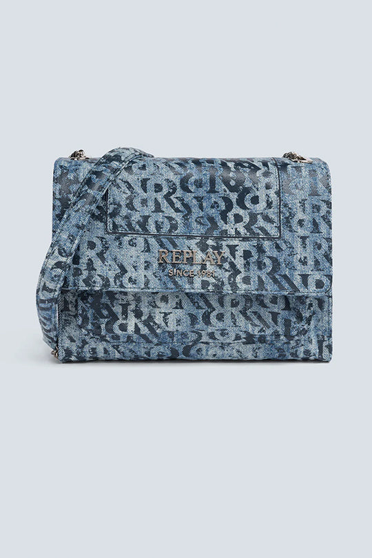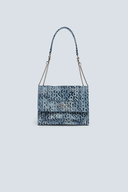 תיק צד אופנתי לנשים עם דוגמת דנים כחולה מודפסת, בעיצוב צעיר ובולט. התיק כולל קלפה קדמית עם סגירה נוחה, לוגו מתכתי מוזהב בחזית ורצועת נשיאה המשלבת בד ושרשרת ליצירת מראה יוקרתי וייחודי.