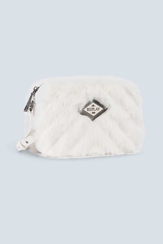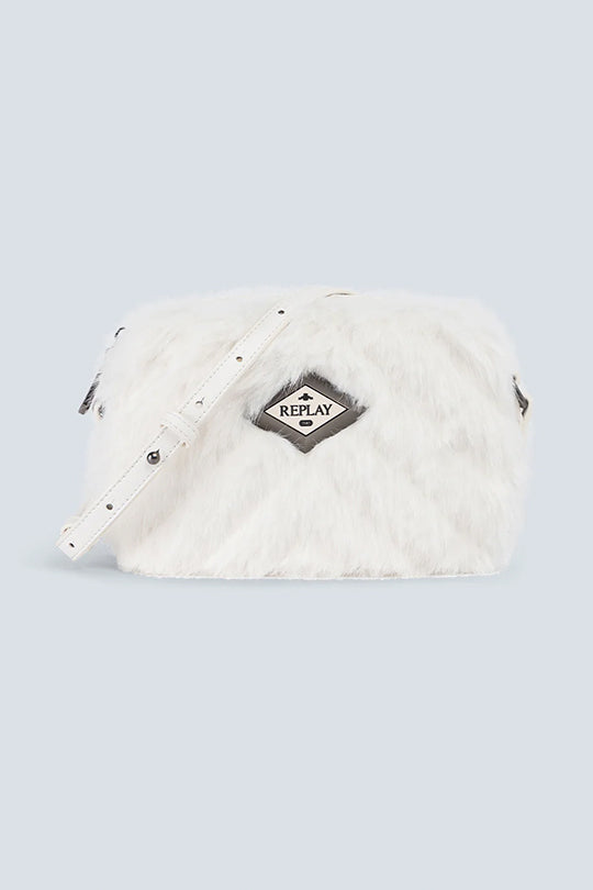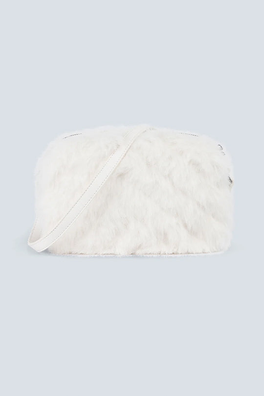 תיק צד לנשים בעיצוב ייחודי בצבע לבן, עשוי בד דמוי פרווה רכה למגע נעים וחורפי. כולל רצועת כתף מתכווננת בצבע תואם ולוגו מתכת קדמי במרכז. מושלם להוספת טאץ' שיקי וחמים לכל הופעה, גם ביום וגם בערב.