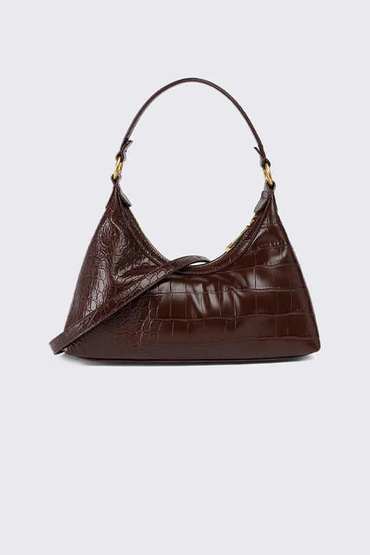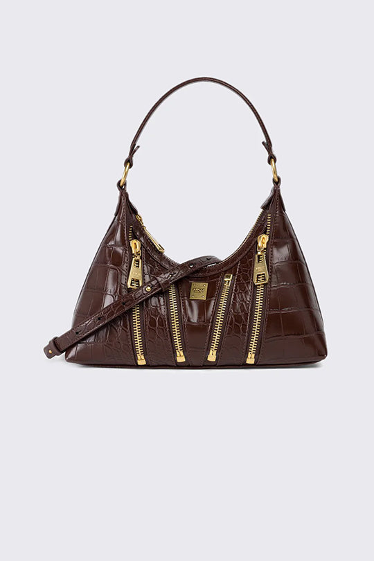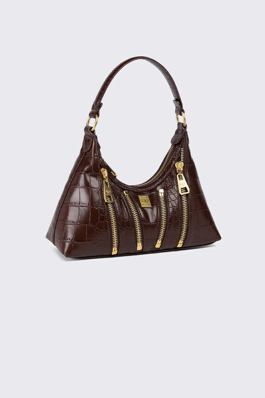 תיק צד אלגנטי לנשים בעיצוב יוקרתי עם טקסטורת קרוקו בגוון חום שוקולד עמוק. כולל ארבעה רוכסנים דקורטיביים בצבע זהב, רצועת כתף ארוכה מתכווננת וידית נשיאה עליונה. סגירה מרכזית עם אבזם מתכת ולוגו עדין. עשוי דמוי עור איכותי, מושלם לשילוב עם לוקים ערביים או יומיומיים עם טאץ׳ מתוחכם ואלגנטי.
