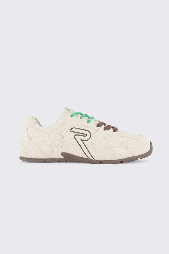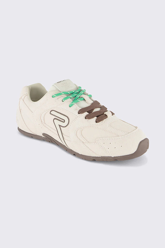 סניקרס לנשים בגוון אוף־וויט עם לוגו R בולט בצד, שילוב שרוכים דו־גוניים וסוליית גומי גמישה לנוחות יומיומית.