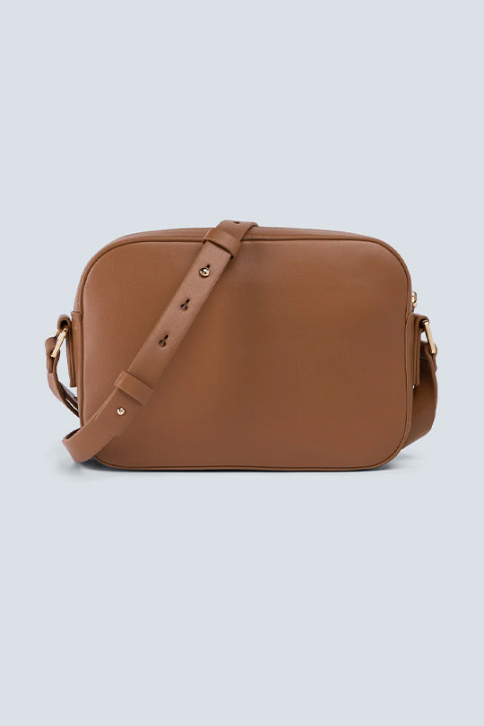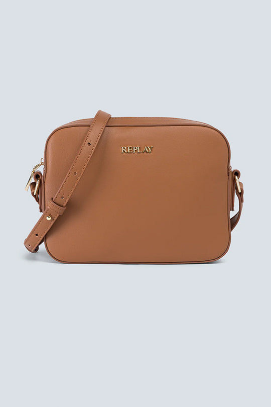 תיק צד לנשים בצבע חום עם כיתוב מובלט