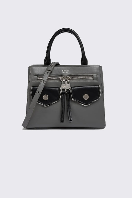 תיק יד לנשים בצבע אפור עם כיסים קדמיים בשילוב שחור