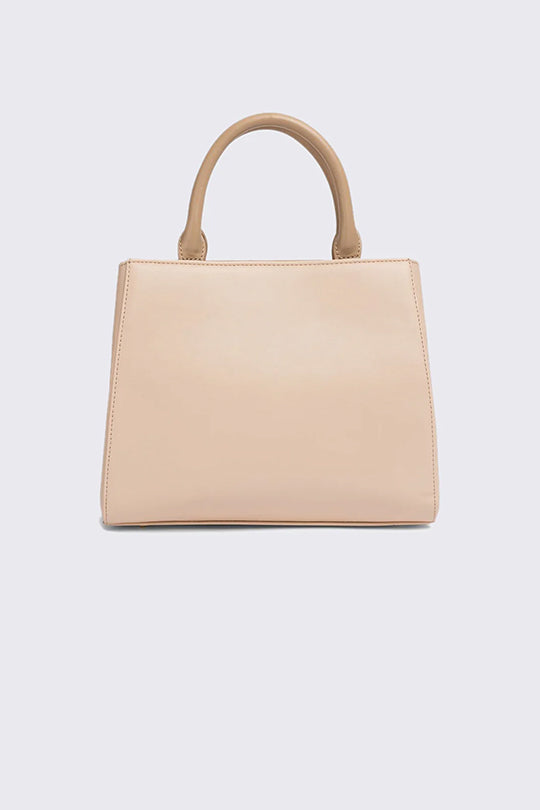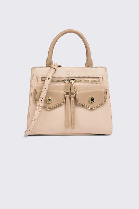 תיק יד לנשים בצבע בז׳ עם כיסים קדמיים ולוגו