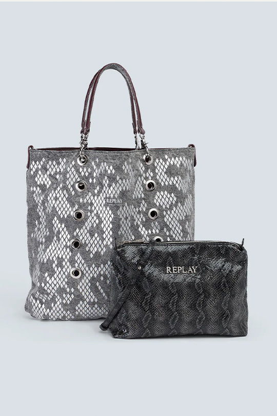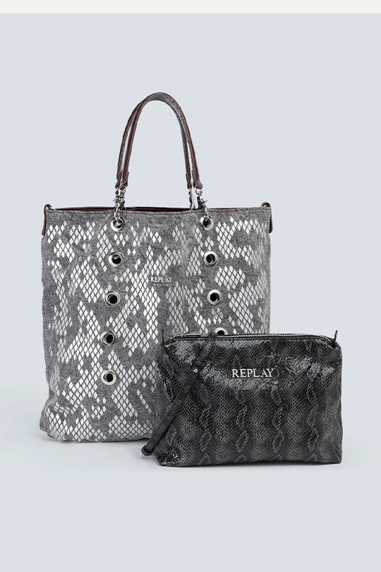 תיק יד לנשים בהדפס נחש אפור עם תיק קטן תואם