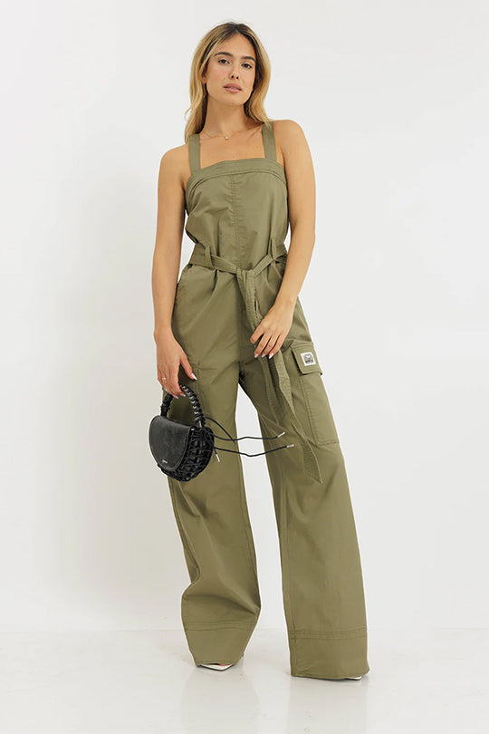 אוברול סטרפלס לנשים בגזרה רחבה בצבע חאקי