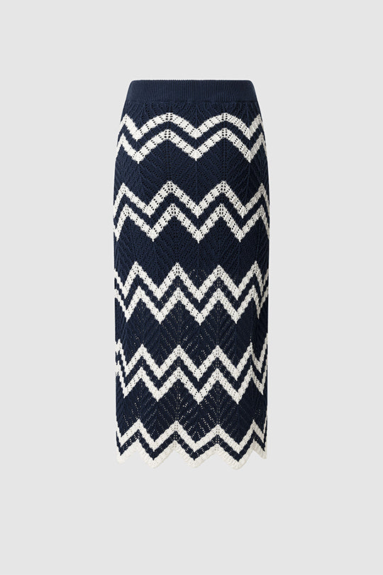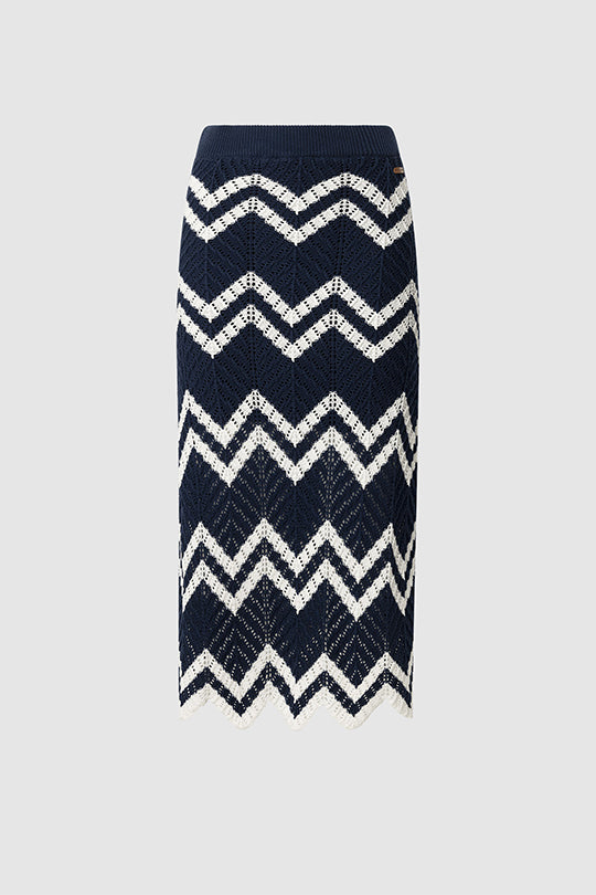 חצאית מידי בגזרת עיפרון מחמיאה, עשויה קרושה עם דוגמת זיגזג קלאסית בשילוב כחול עמוק ולבן. הפריט שישדרג כל לוק עם טאץ' נשי, מתוחכם ומדויק.