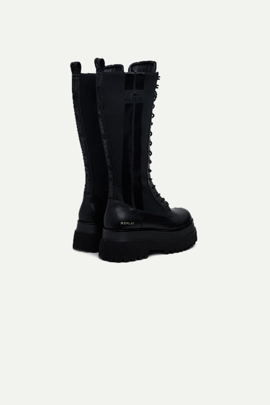 מגפיים גבוהים עם שרוכים לכל האורך ומראה דרמטי. מגיעים בשחור עם סוליה עבה מחוספסת ולוגו מתכתי קטן בצד. גובה הקרסול המוארך יוצר לוק דומיננטי ונקי. מושלמים ללוק חורפי אורבני שמבליט את הנוכחות שלך.