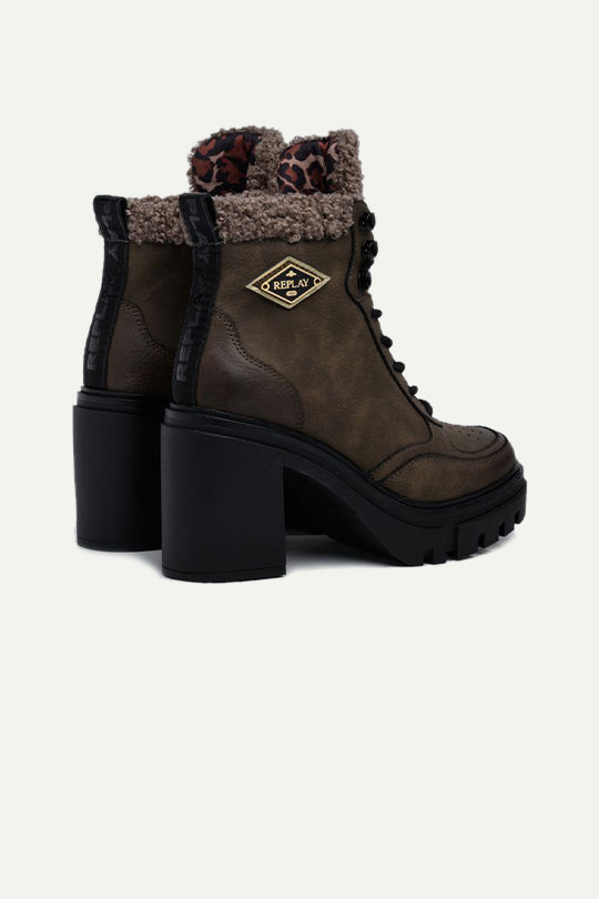 מגפי קרסול לנשים בעיצוב אורבני עם שרוכים ועקב בלוק יציב. חלק עליון במראה עור שחור, פרווה סינתטית רכה סביב הקרסול לנוחות וחימום, וסוליית טרק משוננת עם פלטפורמה למראה עוצמתי ואחיזה טובה. פאץ' לוגו יהלום מוזהב בצד מוסיף טאץ׳ ממותג ואלגנטי. מושלם ללוק חורפי עם ג׳ינס, שמלה או חצאית.
