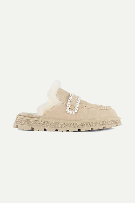 כפכפי Mule פתוחים מאחור לנשים בגוון בז׳, עם גפת מראה זמש רכה וריפוד פנימי מפרווה סינתטית חמימה. רצועה דקורטיבית עם תפרי “וידה” ולחצן מתכתי בחזית, וסוליית טרק עמידה לנוחות ואחיזה מצוינת בבית ומחוץ לו. מושלמות לימים קרירים בעונות המעבר והחורף, משלבות מראה מוקפד עם תחושת נוחות מפנקת.
