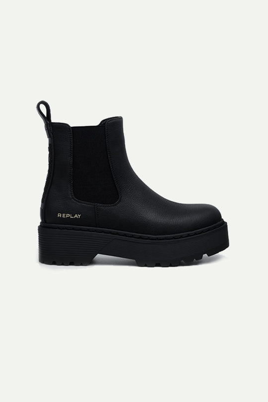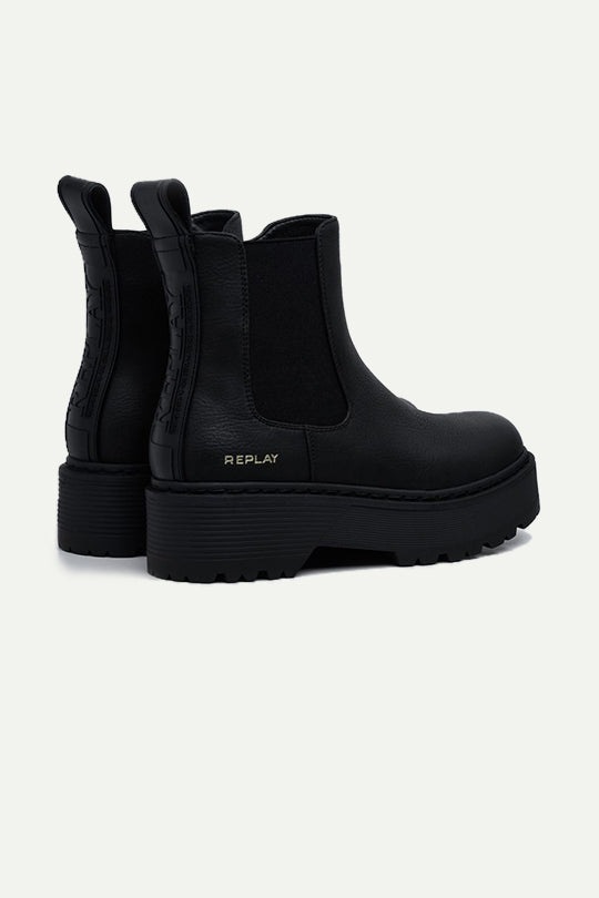 מגפוני צ'לסי על סוליית פלטפורמה גסה עם גומי צידי נוח ולוגו זהוב של REPLAY. עיצוב אורבני שמשדר סטייל ונוחות בכל צעד.